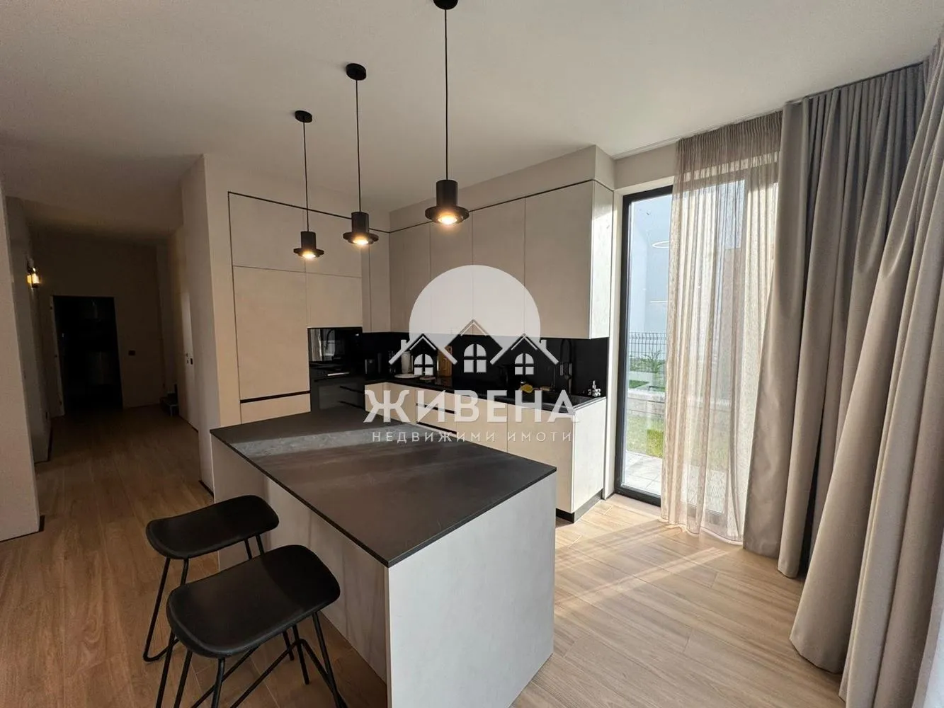 Агенция Живена има удоволствието да Ви представи нова, просторна двуетажна къща, обзаведена с вкус и стил в м-т Зеленика. Жилището е разположенo в тиха и спокойна част над плаж Аспарухово в комплекс New Point, с лесен, целогодишен достъп до имота на свеж въздух и спокойствие от градската суматоха. Помещенията са просторни, с френски прозорци предаващи естествена светлина. Хармоничното съчетание на индустриалния стил на екстериора се прелива с удобни италиански мебели. Разпределението на имота е, както следва: Първо ниво - просторна слънчева дневна стая с вградена кухня и излаз към уютна градина с гледка към гр. Варна, спалня за гости със собствена баня и тоалетна, сервизно помещение, перално помещение, както и отделна тоалетна. Кухнята е оборудвана с качествени електроуреди BOSCH и остров за повече удобство, пространство за приготвяне и място за съхранение. Стълби със стъклен парапет Ви водят към второ ниво на къщата къде ще откриете: Спалня с обща тераса, втора спалня със собствена баня и тоалетна, комфортен кабинет, който може да бъде преправен на 3-та спалня, баня с вана и тоалетна, гардеробна и складово помещение с изградени рафтове за повече комфорт. Къщата е с монтирани климатици, както и цялостно подово отопление и термопомпа. За паркиране на автомобили има самостоятелен гараж, както и открито паркомясто. Комплексът разполага с контролиран достъп с видеонаблюдение и денонощна охрана. На територията на комплекса има изградени: парк за отдих, детска и спортна площадка, зона за BBQ, фитнес и парк за кучета. Таксата поддръжка е 250 лв. на месец. Повече снимки може да разгледате в нашия сайт: jivena.bg. За повече информация и оглед, моля, позвънете на посочения номер за връзка. Оферта 6826