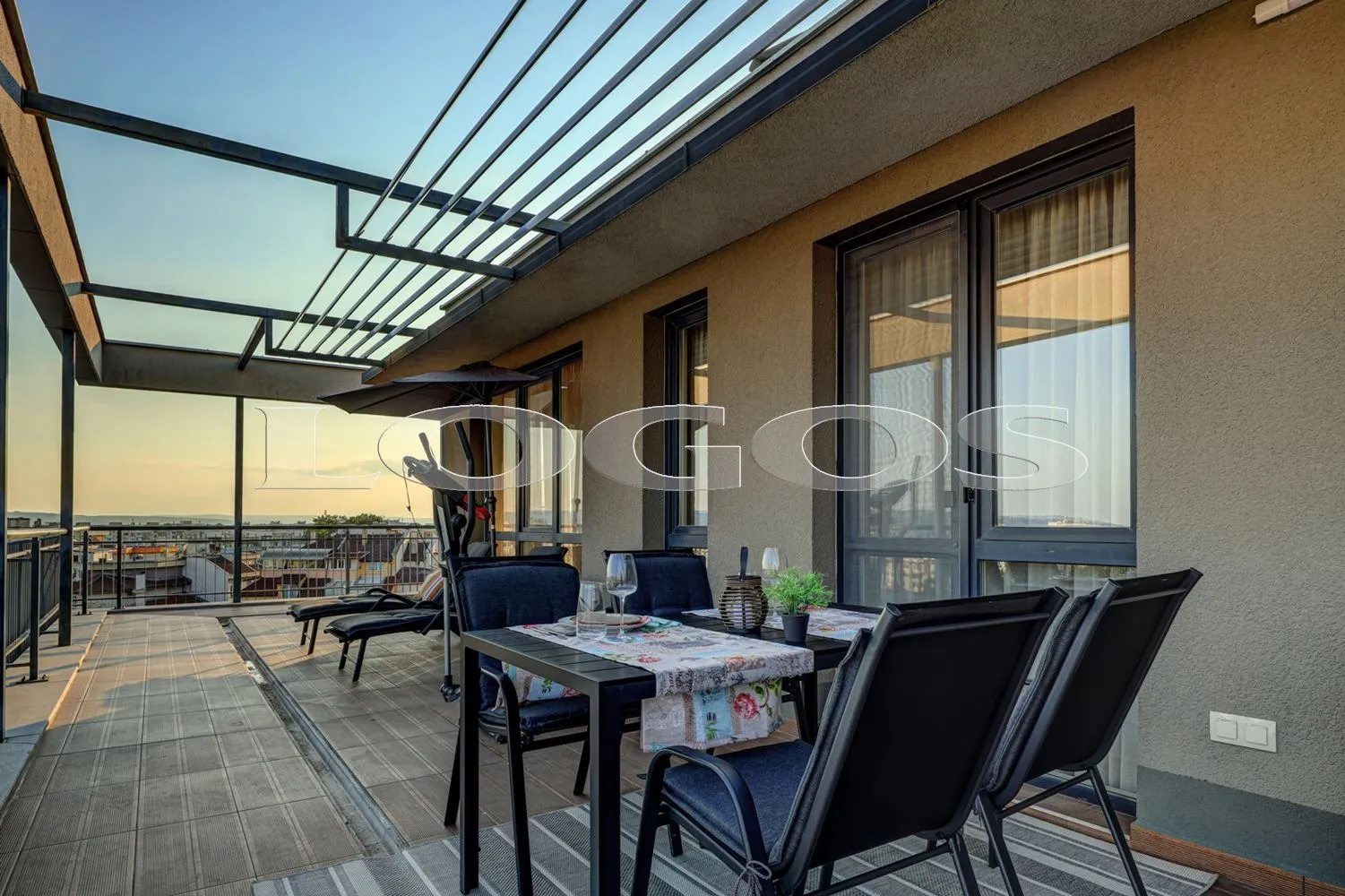 Предлагаме Ви просторен и светъл новообзаведен апартамент в модерен жилищен комплекс VIVA 4. Жилището предлага модерна, комфортна и уютна среда с обща стилова идея, следвана във всички помещения. Акцент са аксесоарите, оригиналните детайли и дизайнерските решения. Апартаментът се състои от дневна зона условно разделена на кътове - оборудвана кухненска част (вградена фурна, керамични котлони, съдомиялна, хладилник с фризерна част), дневна с трапезна маса и холова зона с мека мебел, спалня с удобен дрешник, втора спалня/кабинет, баня с тоалет, втори тоалет и просторна тераса с панорамна гледка, която допълнително засилва възприятието за простор и светлина.