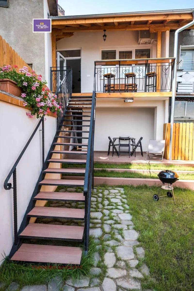 Самостоятелна къща в топ центъра на Велико Търново. Намира се на тиха калдъръмена уличка, на една минута ходене пеш до централната улица на града.На Ваше разположение са две удобни спални, оборудвана кухня и релакс зона. Сутрин, с чаша ароматно еспресо, може да се насладите на панорамната гледка към града и Патриаршията на Царевец от терасата, 50кв. м градина с барбекю ще допълни ежедневието Ви с допълнително чувство на уют и удобство!