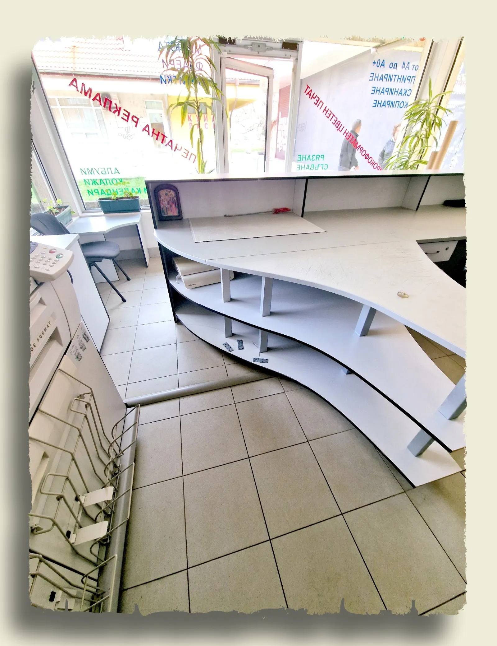 КОД 3649; Утвърден копирен център в търговски център Перник-Димова махала. Ситуиран е до Т-маркет, аптека, спирка на градски транспорт и други разнородни магазини, което говори за постоянен човекопоток. Копицентъра се предлага напълно оборудван с всичко необходимо за дейността. Освен офисните мебели включва още, но не се ограничава само до инженерна машина със скенер XEROX 6204 за копиране и разпечатване на чертежи, цветен плотер IPF CANON 830 за широкоформатно копиране и разпечатване, копирна цветна машина XEROX формат А3 и А4 и други. Към търговската зала има и сервизно помещение.
