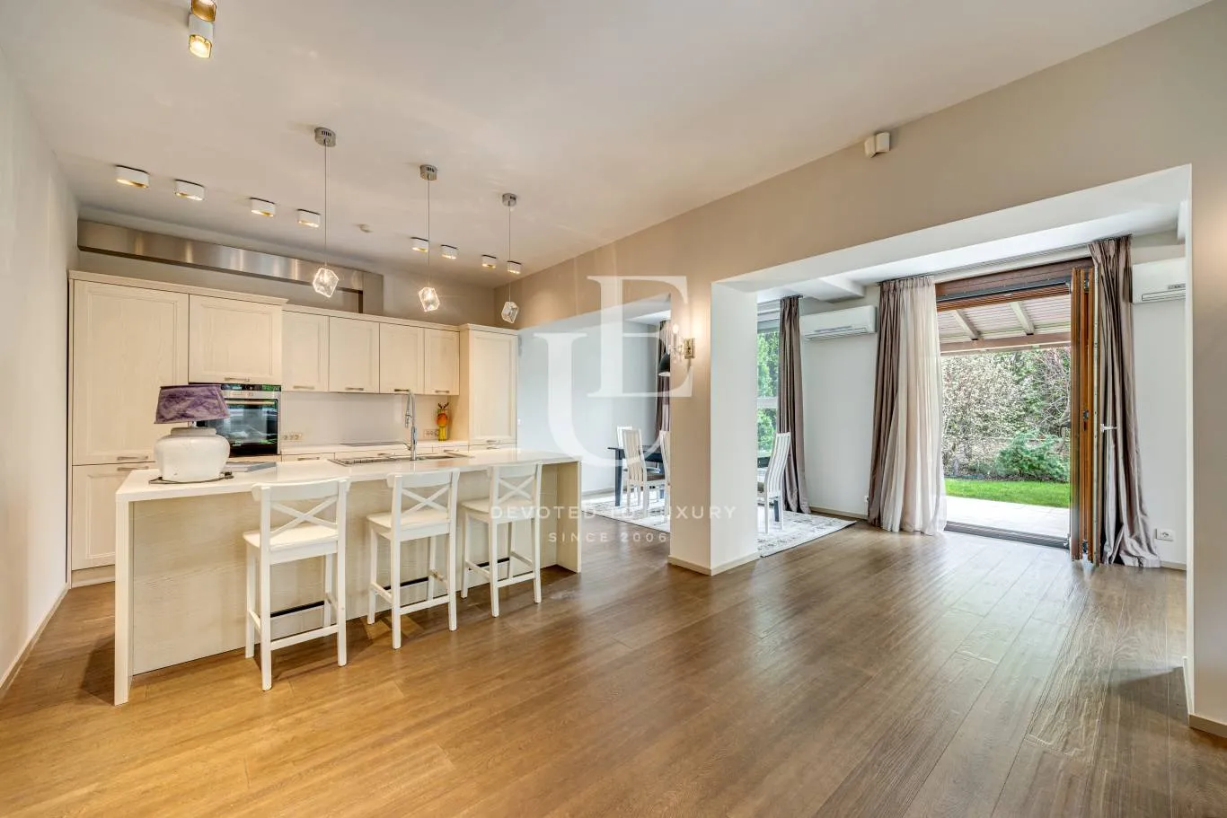 Просторна и слънчева дневна с директен излаз към озеленен двор, напълно оборудвана кухня, обединена с трапезария и хол, четири комфортни спални, голяма гардеробна стая, зона за релакс със сауна и вътрешно джакузи, санитарни помещения, сервизни и складови площи