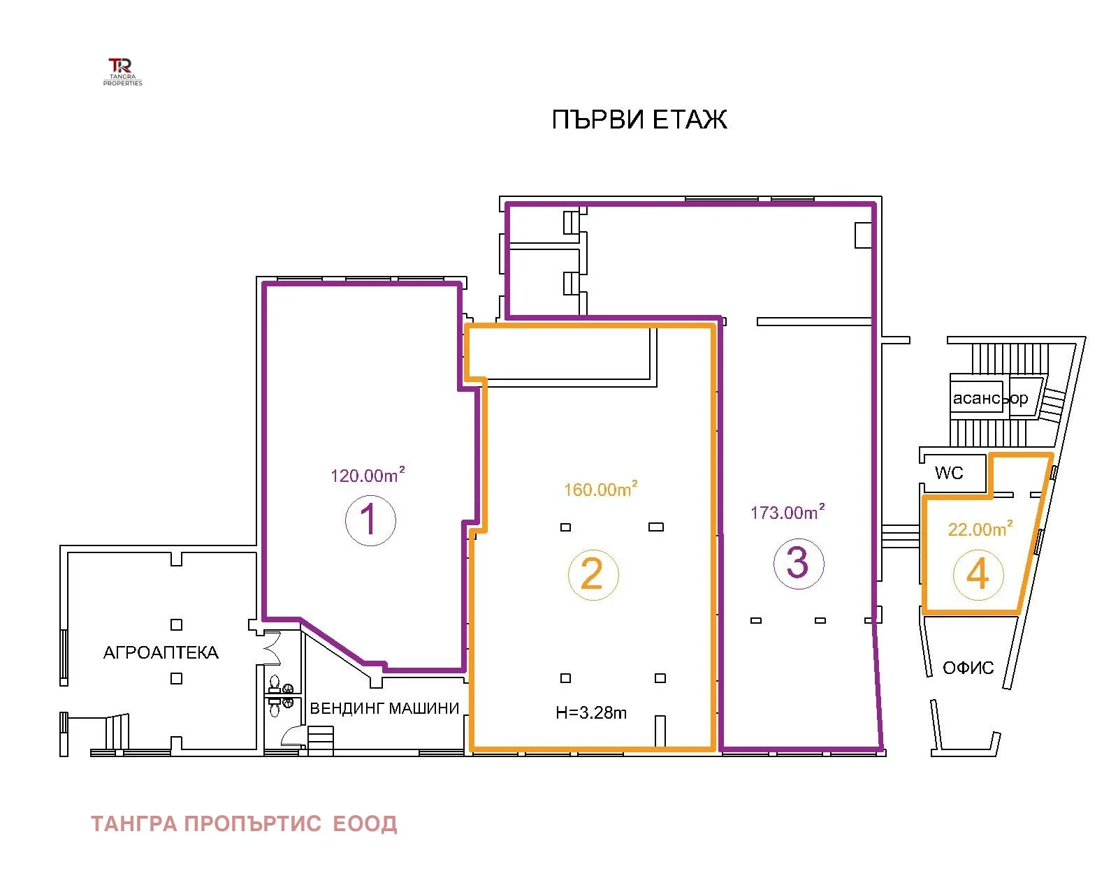 На първия етаж помещения 1, 2 и 3 могат да бъдат обединени в едно или да бъдат комбинирани 1 с 2 или 2 с 3. Могат да са и отделени самостоятелно като в зависимост от желанието на клиента могат да се направят витрини към главната улица. Помещение 1 няма лице към главната улица, но ако бъде взето като самостоятелно, може да се обедини с вендинга пред него.