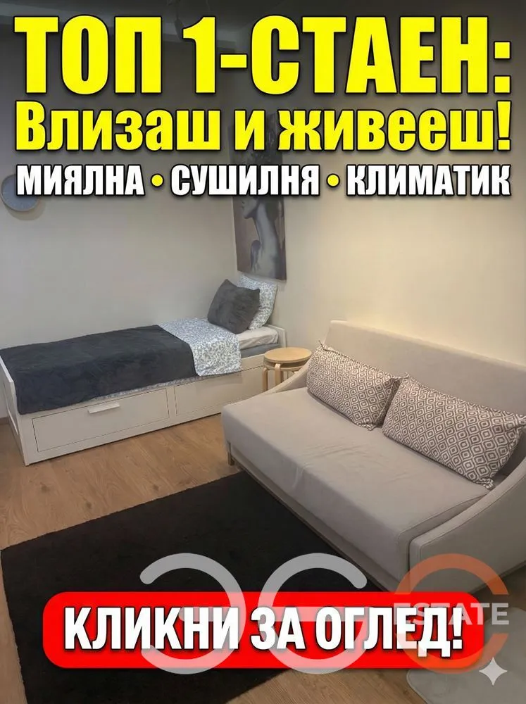 Отдавам под наем дългосрочно напълно обзаведен едностаен апартамент. Жилището е в отлично състояние, готово за незабавно нанасяне.Предимства и оборудване: • Кухня: Напълно оборудвана, включително миялна машина, хладилник, фурна/котлони. • Пране: Комбинирана пералня със сушилня (висок клас удобство). • Отопление/Охлаждане: Инверторен климатик. • Обзавеждане: Легло, разтегателен диван, гардероб и мебели за съхранение (както се вижда на снимките). • Свързаност: В цената/пакета са включени оптичен интернет и цифрова телевизия.Локация: Намира се в Идеален Център, на комуникативно място близо до Спирки и Магазини.Условия за наемане: • Без домашни любимци. • Дългосрочен наем. • Депозит + първи наем.За повече информация и огледи, моля свържете се на посочения телефон.0892045717 - Йоанна Данаилова