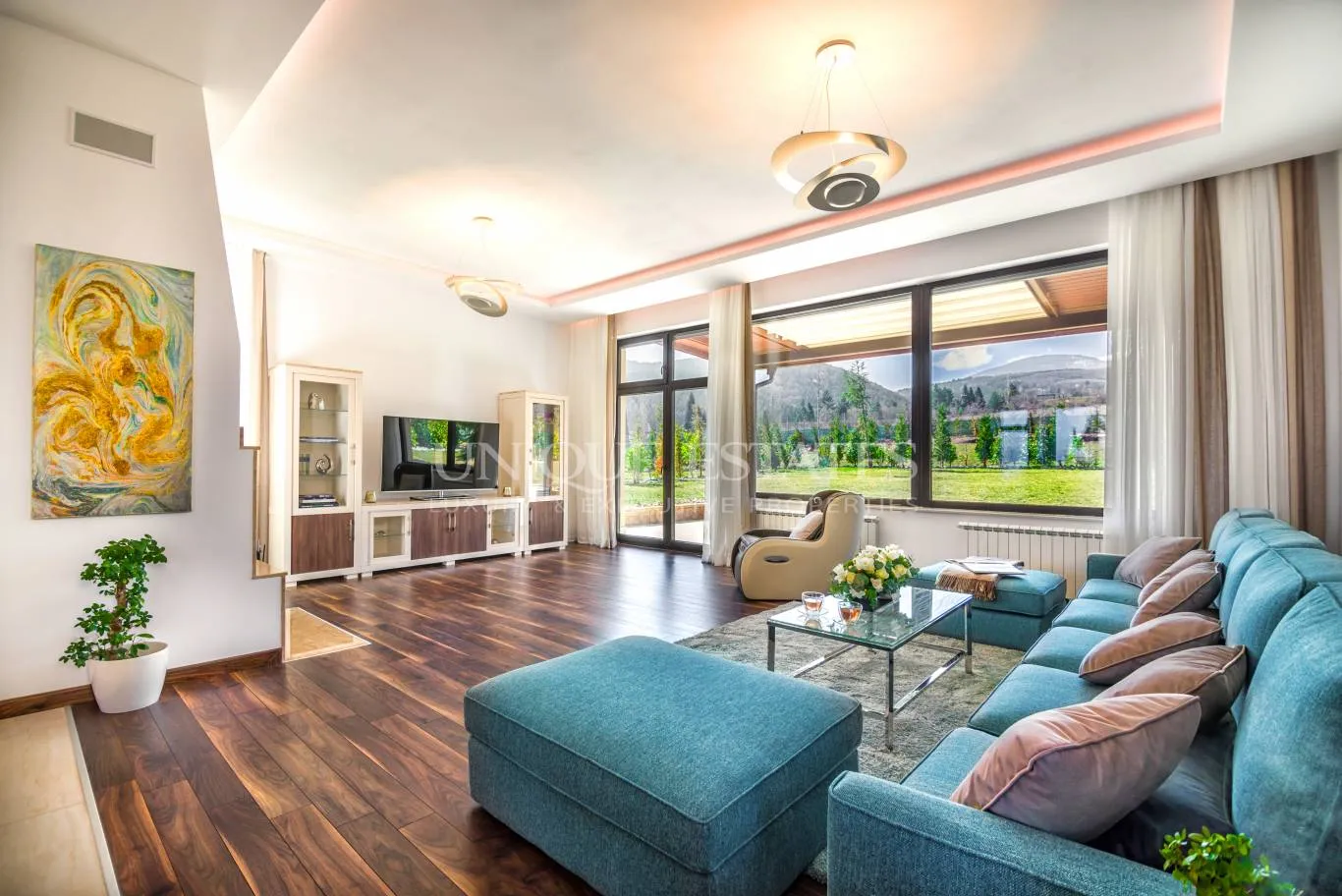 Unique Estates представя напълно обзаведена, самостоятелна къща в луксозен затворен комплекс с ограничен достъп. Къщата разполага с прекрасен озеленен двор, с площ от 868 кв.м. От всички помещения се разкриват панорамни гледки, височините на таваните са между 3,20м. и 3,50м. Покривната тераса е с гледка 360 градуса и барбекю. Комплексът разполага със спортна площадка и беседки, 24-часа жива охрана и богато озеленяване, новоизградена инфраструктура. Разпределение:Сутерен: двоен гараж, фитнес, сауна , баня с тоалетна, мокро помещение, сервизни помещения, техническо помещение. Първо ниво:Входно фоайе, просторен хол с трапезария и напълно оборудвана кухня , излаз към покрита тераса и двор, сервизно помещение до кухнята, тоалетна за гости. Второ ниво: Две големи спални по 25 кв.м всяка, и към всяка спалня голям дрешник и голяма баня, два балкона. Трето ниво: Две големи спални по 25 кв.м. , и към всяка спалня голям дрешник и голяма баня, два балкона. Покривна тераса до която стига асансьора. Предимства:Затворен комплекс с 24-часова охранаНапълно обзаведенаДвоен гараж и две паркоместаАсансьор, фитнес, саунаСамостоятелен озеленен двор с изградена поливна системаИзградена нова инфраструктура и канализация (Ref. ID:24271)
