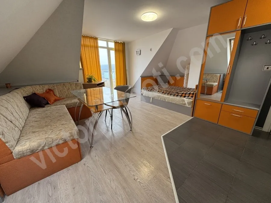 Екипът на Виктория имоти предлага на Вашето внимание едностаен просторен апартамент в непосредствена близост до парк Дружба. Жилището се намира на последен етаж с югоизточно изложение в нова сграда с асансьор. Площта му разпределена между основно помещение, разпределено на кътове - кухненска част, трапезария и спалня, отделно има баня с тоалетна и тераса. Обзаведено и оборудвано с всички необходими мебели и електроуреди. За отопление и охлаждане има монтиран климатик. #13463