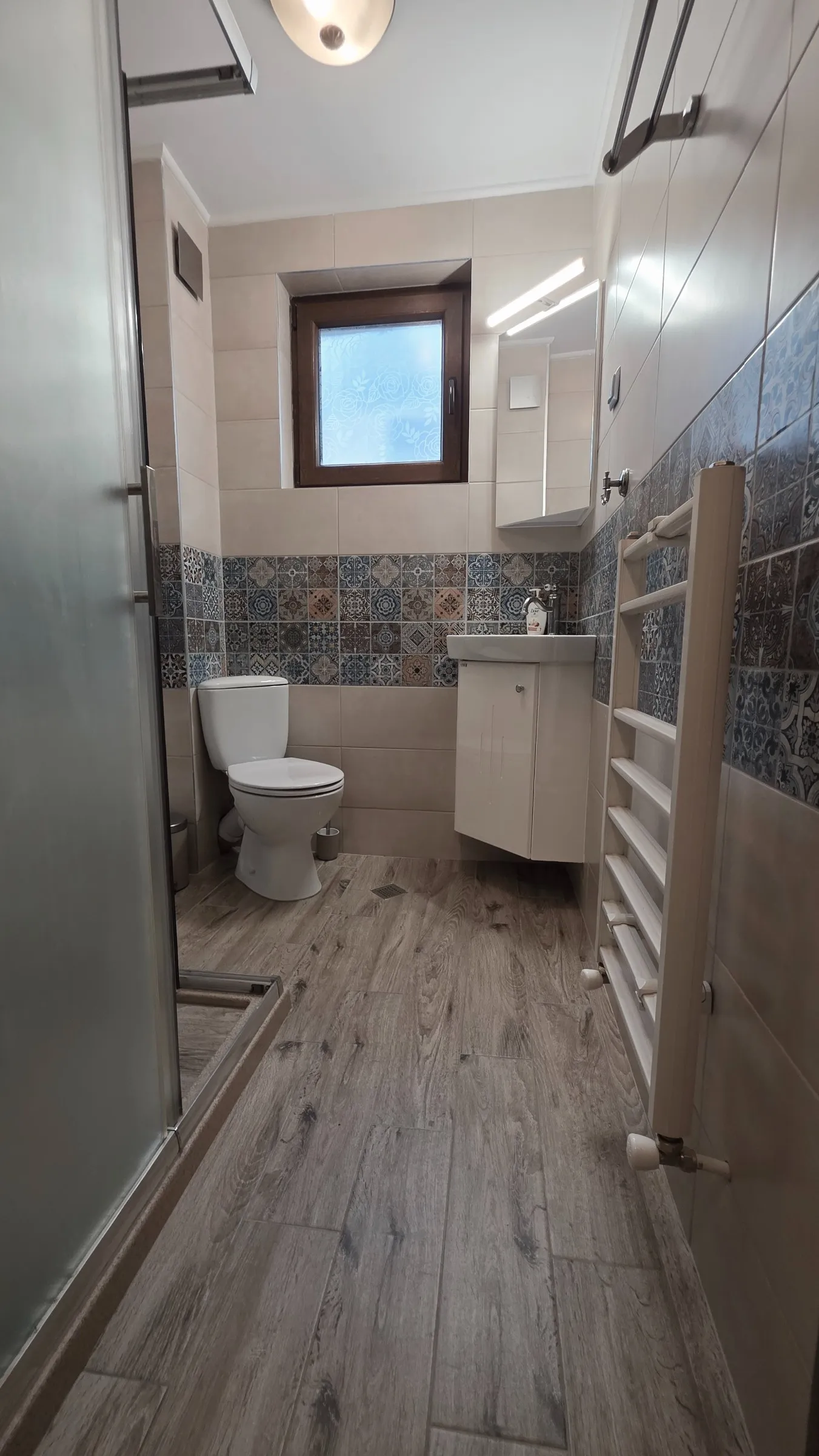 Разпределението е изключително практично - баня с тоалетна и втора тоалетна, комбинирана с мокро помещение. Рядко срещано удобство при двустайните жилища, което прави имота отличен избор за дългосрочно наемане.