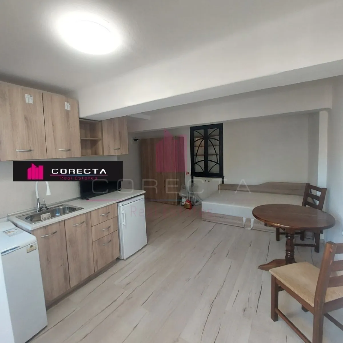 КОРЕКТА ЕСТЕЙТ Ви предлага обзаведено студио с голяма тераса в топ центъра на гр.Русе, на метри от улица Александровска. Жилището е с площ от 30кв.м, разположено на първи етаж. За отопление и охлаждане е монтиран инверторен климатик.