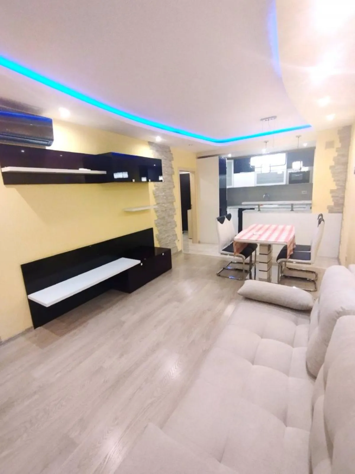 Състои се от: Входно антре, 2 спални, баня с тоалетна, хол с кухненски бокс, отделна тоалетна и тераса . Отоплението на апартаментът е чрез ТЕЦ. Апартаментът е ново строителство!