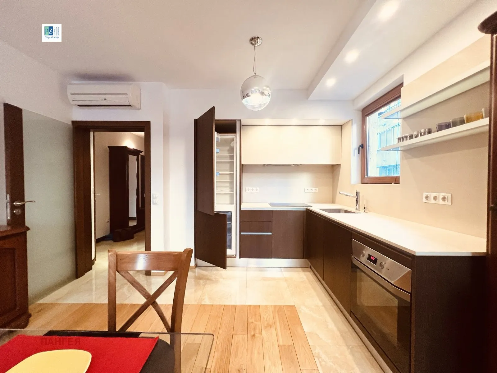 Пангея груп представя един от апартаментите в нея, разположен на втори етаж, който очаква своите първи наематели. Обзавеждането и обурудването са чисто нови. Подходящ е най-вече за семейство с деца или за хора съчетаващи обитаването и работата от вкъщи. Имотът се състои от просторен хол с кухненски бокс, трапезарна част и кът за релакс с мека мебел. Притежава две спални, от които едната е обзаведена с двойно легло, гардероб и нисък шкаф. Втората към момента е обособена като офис, но може да бъде преобзаведена според нуждите на новия наемател. Апартаментът разполага с баня с тоалетна и отделна самостоятелна тоалетна и тераси, достъпни от дневната и от спалните. Коридорът предлага портманто, гардероб и шкаф за обувки. За препарати и почистващи принадлежности място има в килера. Пералнята е инсталирана в шкаф/ниша в коридора. Метростанция България е на броени метри.