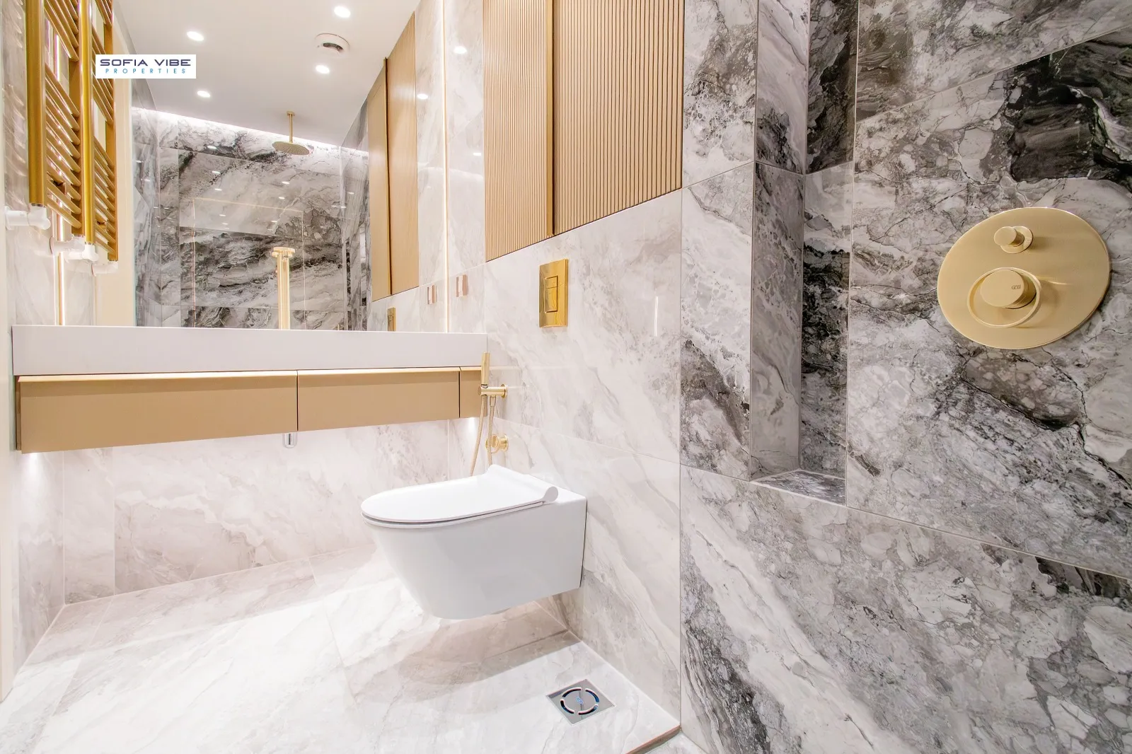 The property is situated on a high floor of the residential tower, with a limited number of apartments per floor, providing a calm living environment, controlled security, and open panoramic views of the city and Vitosha Mountain.