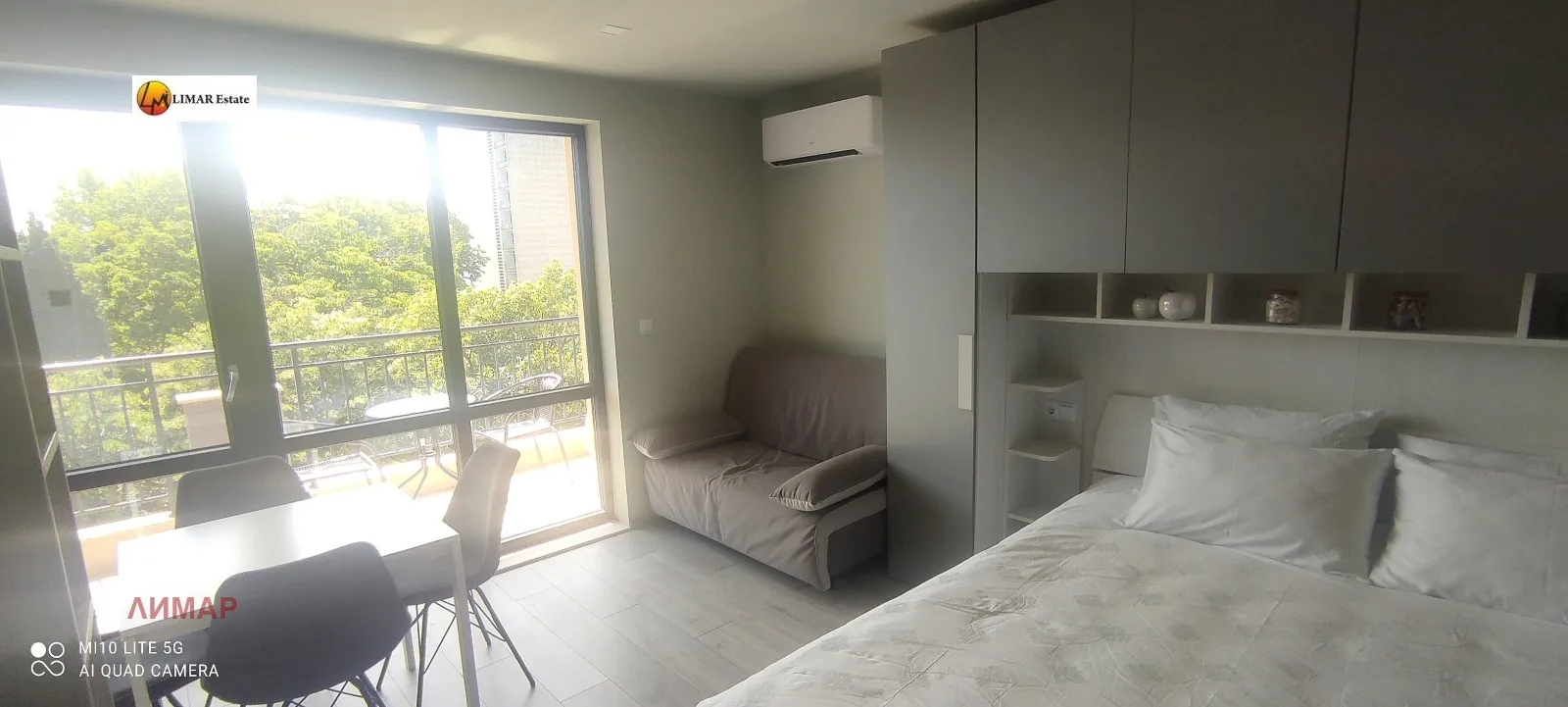 Жилището се състой от една стая, която е с кухненска част / кухненски шкафове, керамични котлони, ширм, фурна, съдомиялна и хладилник /, спалня, маса за хранене, разтегателен диван, телевизор. Баня и тоалет в едно. Тераса с масичка и столове. Обзавеждането е ново !