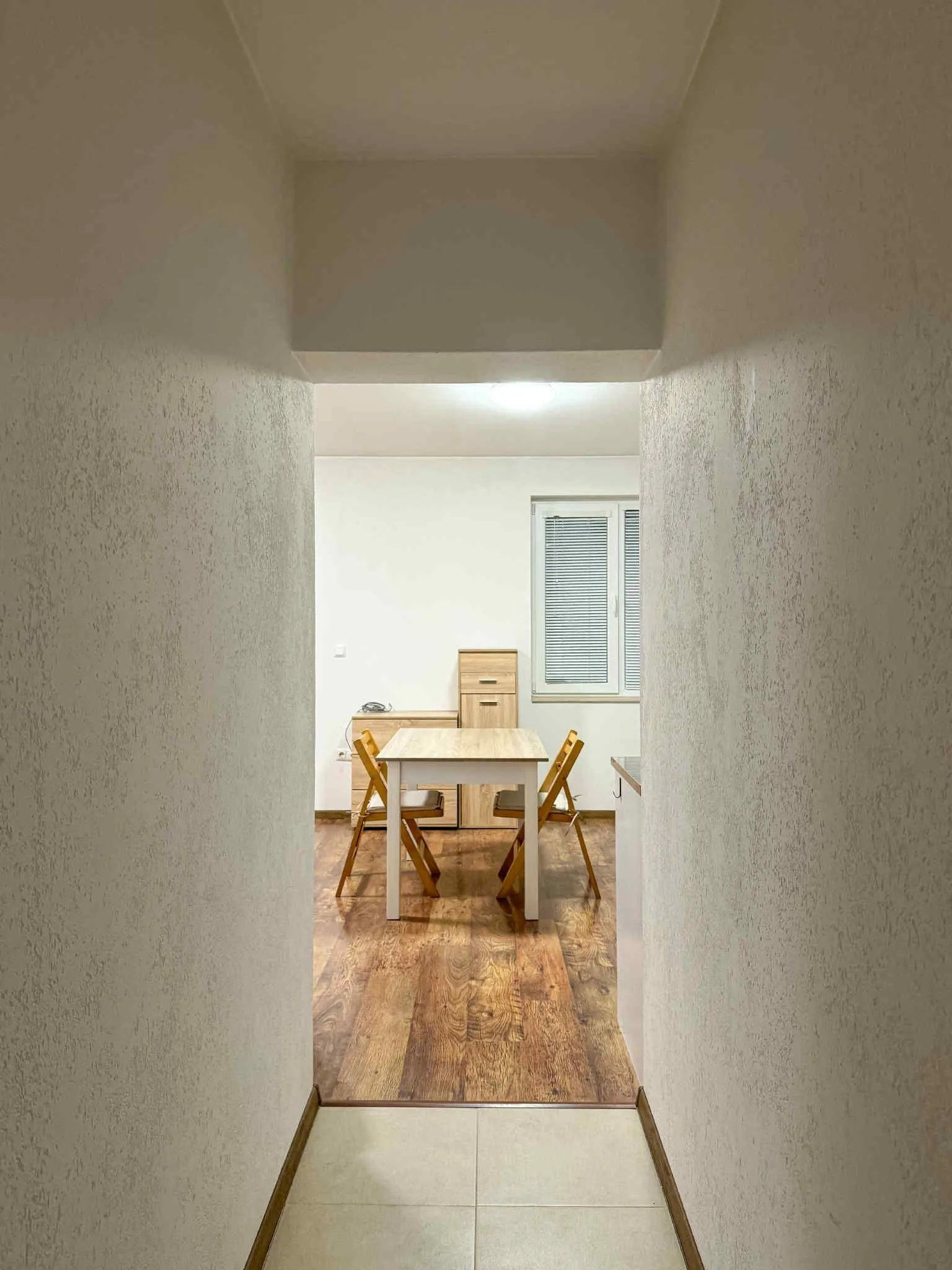 Разпределение: входно антре, кухненски бокс с трапезария и обособен спален кът, баня с тоалетна и тераса