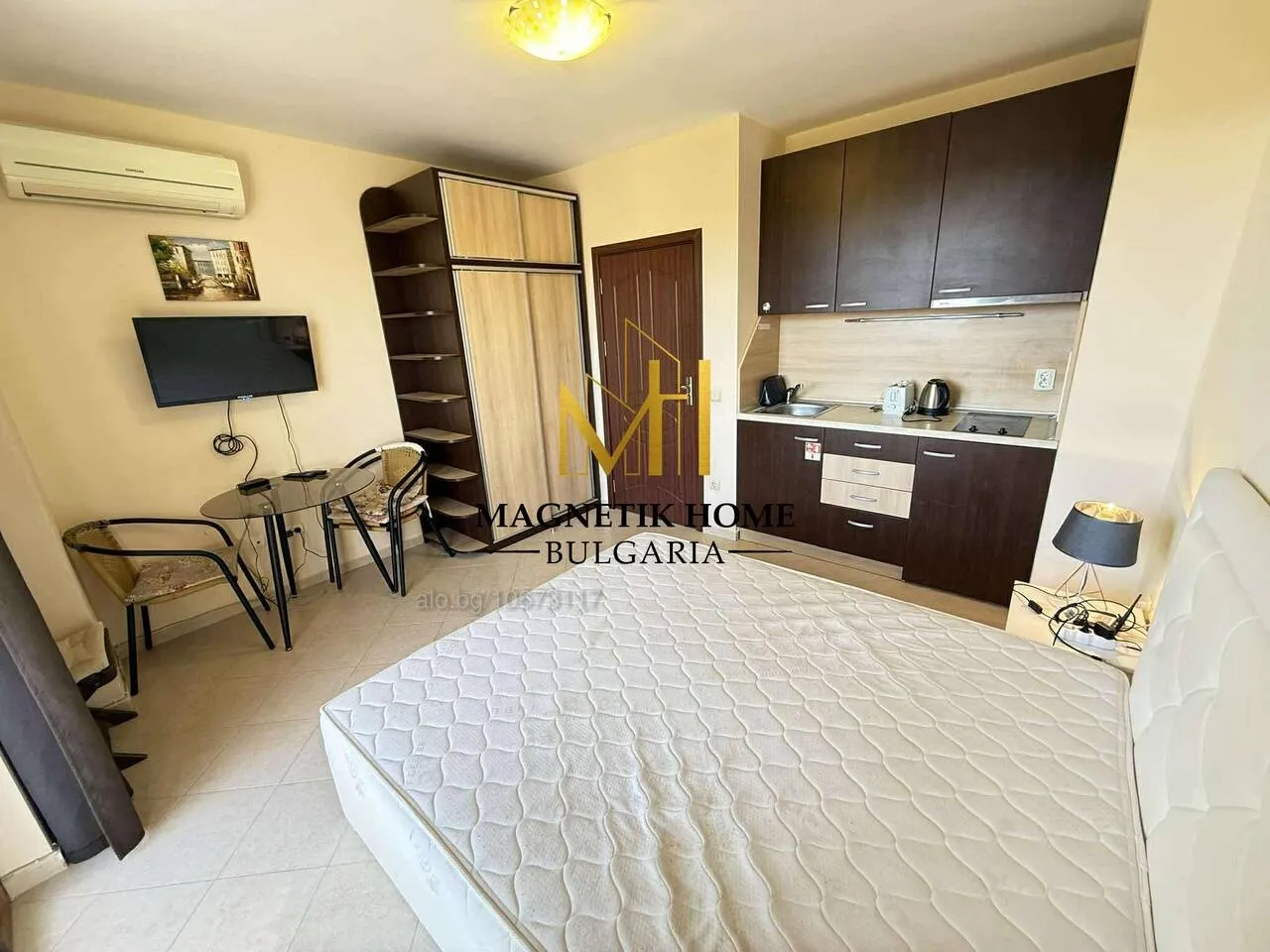 Драги наематели, Ние от агенция за недвижими имоти Magnetik Home имаме огромното удоволствие да ви зарадваме с тази неустоима оферта, а именно уютно студио в комплекс Cascadas Family Resort в Слънчев Бряг.Разпределението на имота се разгръща както следва: входно антре, баня с душ кабина + тоалетна, общо спално / холно помещение с кухненски бокс и открита тераса.Изложението на имота е ЮГО - ИЗТОЧНО, което го прави изключително топло, допринасящо за по - ниските консумативни разходи през зимните месеци, като важно уточнение е че апартамента е изцяло САНИРАН вътрешно и външно.Апартаментът е оборудван изцяло до най - малкият детайл като в допълнение се предлагат чисто нов инвенторен климатик, СМАРТ телевизор, микровълнова, високо - качествени електроуреди, кафемашина, прахосмукачка, ютия, цялостна кухненска посуда, спално бельо и т.н.Също така да не забравяме и перфектна локация на жилището, поради факта че се намира в един от най - желаните райони за живеене в Слънчев Бряг в непосредствен в близост до главната пешеходна алея, ресторант Джанни , хотел Кубан, автогарата и т.н.Сградата е ново строителство и е с отлични общи части!Ще се радваме да удовлетворим вашите най - дълбоки желания и нужди, затова не се притеснявайте да ни потърсите за всеки един допълнителен въпрос касаещ имота или други наши предложения!