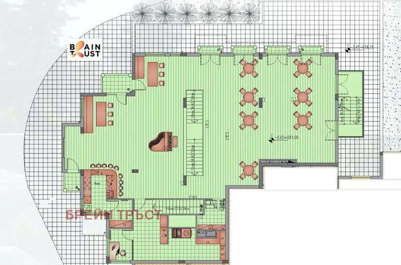 Брейн Тръст предлага под наем имот подходящ за заведение, магазин и ресторант, търговски обект, с отлична локация, в непосредствена близост до Околовръстен път и кръговото на Драгалевции - бъзоразвиващо се и комуникативно място.Районът е с концентрация на търговски обекти - Магазините Фантастико и Lidl, което води съсредоточие на голям човекопоток и обуславя възможността на да се развива всякакъв вид дейност.Помещението е на две нива, разположено на партер и първи етаж, в жилищна сграда, като в съседство има още два търговски обекта с градинка и паркинг пред тях.Помещението е със статут на Бистро, а полезната площ е 686 кв. м, с функционално разпределение на помещенията, съответно:Първо ниво - площ 379.05 кв м - салон, складови/сервизни помещения, битова стая за персонал, топла кухня, помещение за хладилна камера, инсталационно помещениеВторо ниво - площ 306.76 - градина, салон с витражи, бар, обслужващи и сервизни помещенияИзградена инсталация за вентилация и отопление с газ.Прилежащи външни части с площ от около 100 кв. м, които могат да се превърнат в прекрасна лятна градина.Има възможност за паркиране пред обекта, на открит паркинг за всички търговски обекти в сградата.Обектът е с потенциал за развиване на много видове дейностиОфертната цена не включва ДДС, който се начислява допълнително.Код на оферта Z-4754За повече информация: 0877 214 549Виж всички обяви в braintrust.bazar.bg или тук