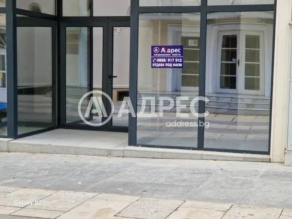 Търговско партерно помещение на Ларго с площ 227 кв. м. Разполага с голяма зала, складово помещение и санитарен възел,тераса и втори склад 25 кв.м. Големи витрини, два входа/ има вход към главната пешеходна улица/. Имотът е завършен и е в отлично състояние. Има статут на заведение. Подходящо за банков или застрахователен офис, за мобилен оператор, магазин, заведение, книжарница и др. Цената е без ДДС. Първи наематели. Възможен коментар.