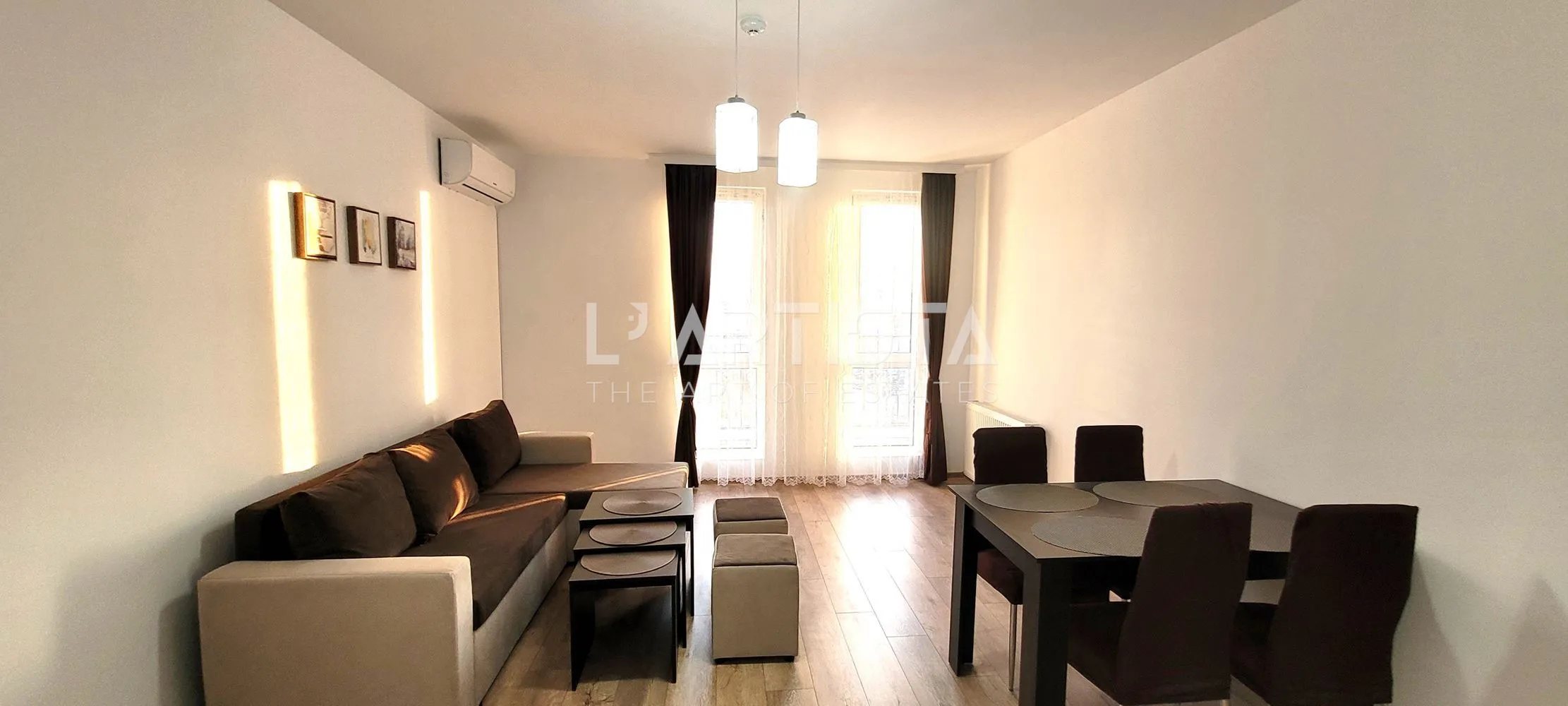 L"Artista отдава нов обзаведен двустаен апартамент със застроена площ от 54.33кв.м.Реф.№ Z-Z-1170Състои се от : антре, дневна с кухненски бокс и трапезария, спалня с балкон и баня с тоалетна.Предлага се напълно обзаведен. Отопление с климатици. Топла вода на бойлер. Изложение югозапад. Прекрасна гледка към планината.Жилището е в нова сграда с модерни общи части, асансьор и хубав озеленен двор.Към апартамента има и открито паркомясто.L'Artista е първата агенция в България, която предлага не само посредничество при покупко-продажба на недвижими имоти, но и широк спектър от финансови услуги - кредитиране, застраховане, инвестиционни фондове, пенсионно осигуряване и други, които осигуряват стабилност за Вашето бъдеще.Намерете всичко, от което се нуждаете за вашите имоти и финансова сигурност на едно място.