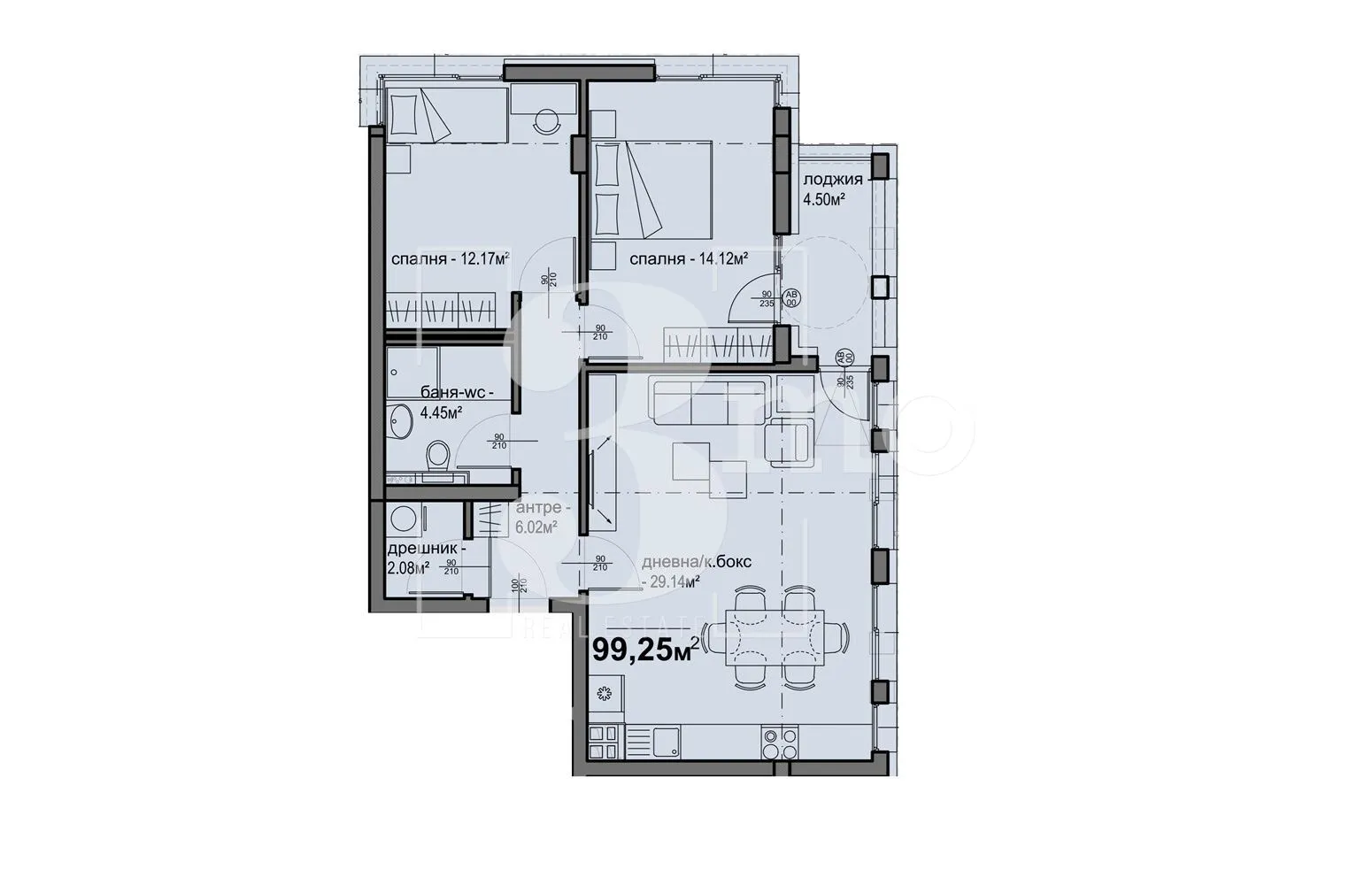 3mo Амалтея има удоволствието да ви предложи тристаен апартамент в нова модерна жилищна сграда. Планирано разрешение за ползване в края на 2026-та година. Намира се в ж.к. Люлин 5 на комуникативно място. Предложеният имот е с обща площ от 99,25 кв.м. (застроена 88,29 кв.м.) и се състои от: входно антре (6,02 кв.м.), всекидневна с кухненски бокс и трапезария (29,14 кв.м.) с лоджия (4,50 кв.м.), спалня (14,12 кв.м.), втора спалня (12,17 кв.м.), дрешник/складово помещение (2,08 кв.м.) и баня с тоалетна (4,45 кв.м.). Жилището е разположено на осми от общо девет етажа. Има изложение запад и север. Отоплението е чрез газ. Към имота може да се закупи паркомясто или гараж. Инвеститорът е с богат опит, специализиран в изграждането на качествени жилищни сгради, като прилага най-новите технологии и иновации в строителството. В близост до имота са разположени множество търговски, хранителни и денонощни магазини и обекти. Също така детска градина, училище и удобен градски транспорт с бърз превоз до метростанции "Люлин", "Западен парк" и "Сливница". Връзката с централната и други части на столицата се осъществява посредством бул. "Петър Дертлиев", бул. "Добринова скала" и Околовръстен път. Агенцията ни предлага безплатна консултация и съдействие на своите клиенти при покупка на имот чрез ипотечен кредит. За повече информация и организиране на огледи, моля свържете се с нас на посочените телефони!