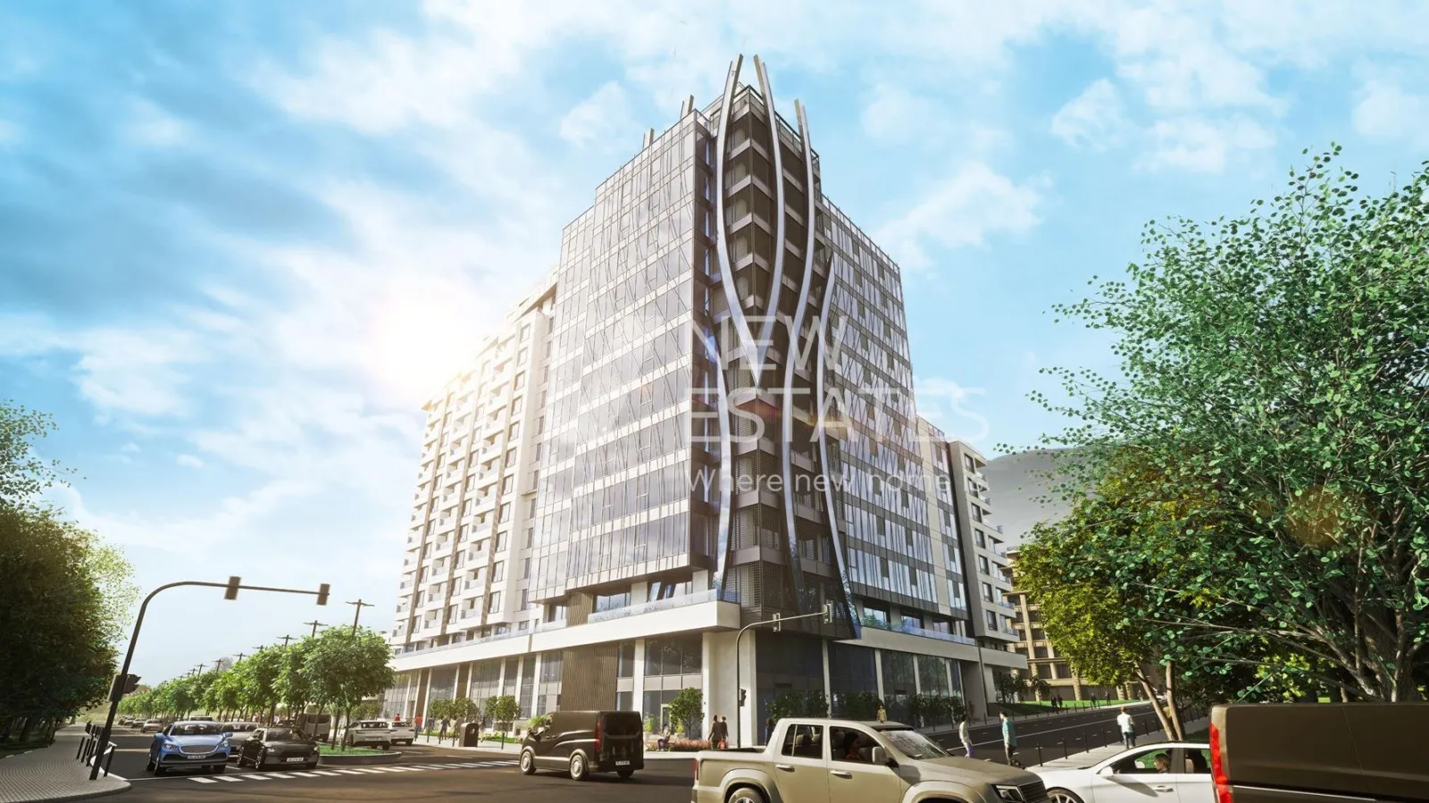 New Estates представя тристаен апартамент в нов комплекс, който предлага първокласно изживяване в 'новия' център на София. Проектът е разположен в непосредствена близост до планината, по самия булевард 'Черни връх', с бърз достъп до Околовръстния път на столицата, търговския център 'Парадайс' и бъдещата метростанция от разширението на линия 2. Комплекът се състои от шест сгради съчетани с изискан дизайн и разнообразие от обекти, включително фитнес център, СПА зона, детски кът и офиси с клас 'А'. Част от удобствата предлагани от проекта са денонощна жива охрана и видеонаблюдение, и наличието на BMS Parking система, улесняваща и контролираща достъпа до паркинг местата.