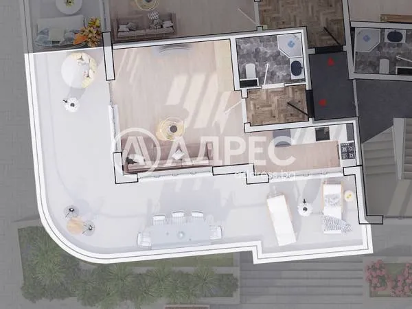Еднопространствен апартамент със застроена площ 52,16 кв.м + тераса 43,10 кв.м. Разпределение: предверие, дневна с кухненски бокс 27,64 кв.м и баня с тоалетна. Възможност за закупуване на паркомясто в сутерена на сградата на цена 38500 евро.