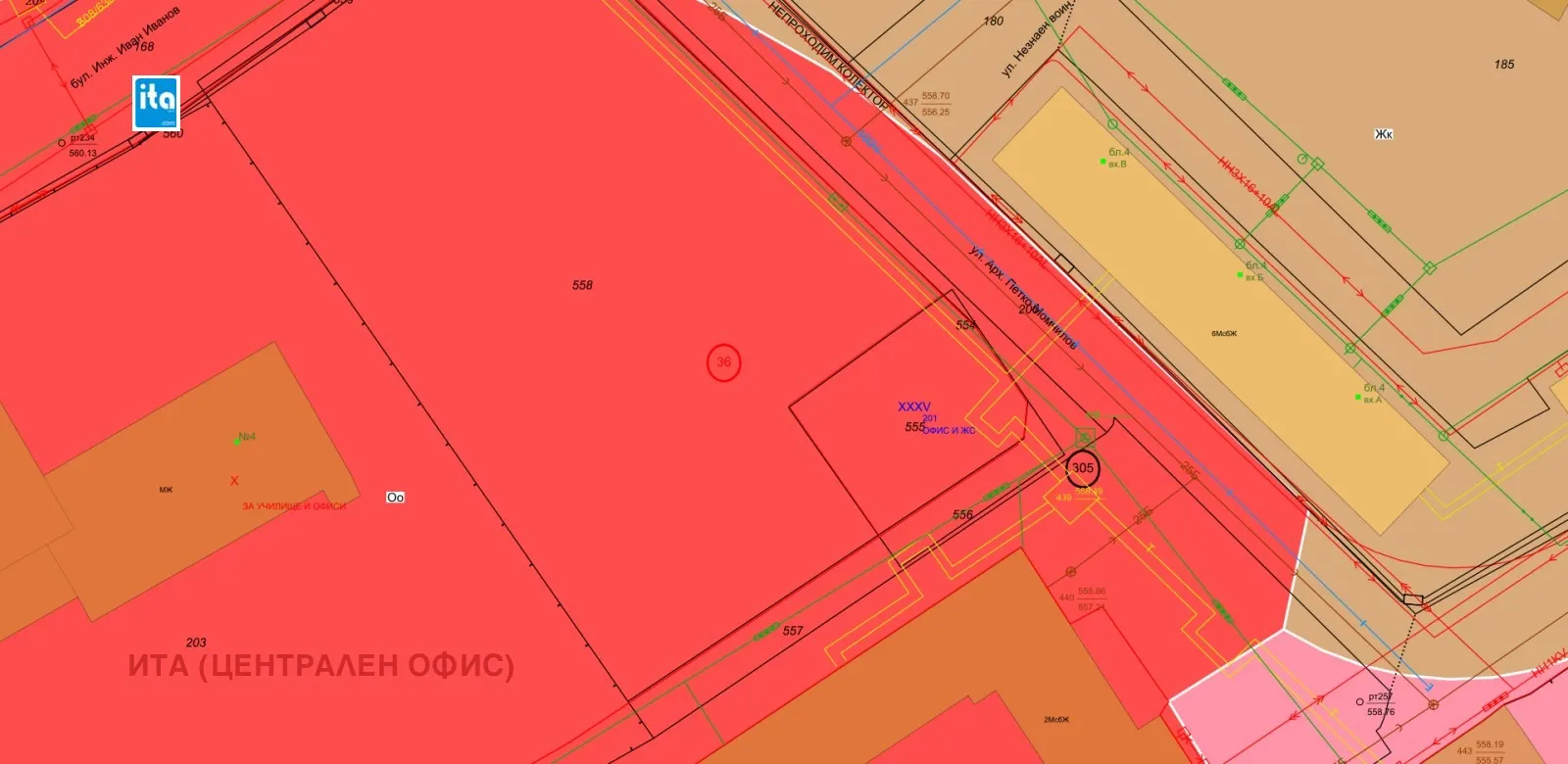 Агенция'ИТА ИМОТИ' предлага парцел в ж.к.'Сердика', с виза за построяване на сграда офиси и жилища; Имотът е ъглов, идентификатор: 68134.305.555, попада в зона Оо с показатели: кинт 3, пл.застрояване 60%, к.к. 20м. За огледи и повече информация: Светла Нешева, тел.0898544081