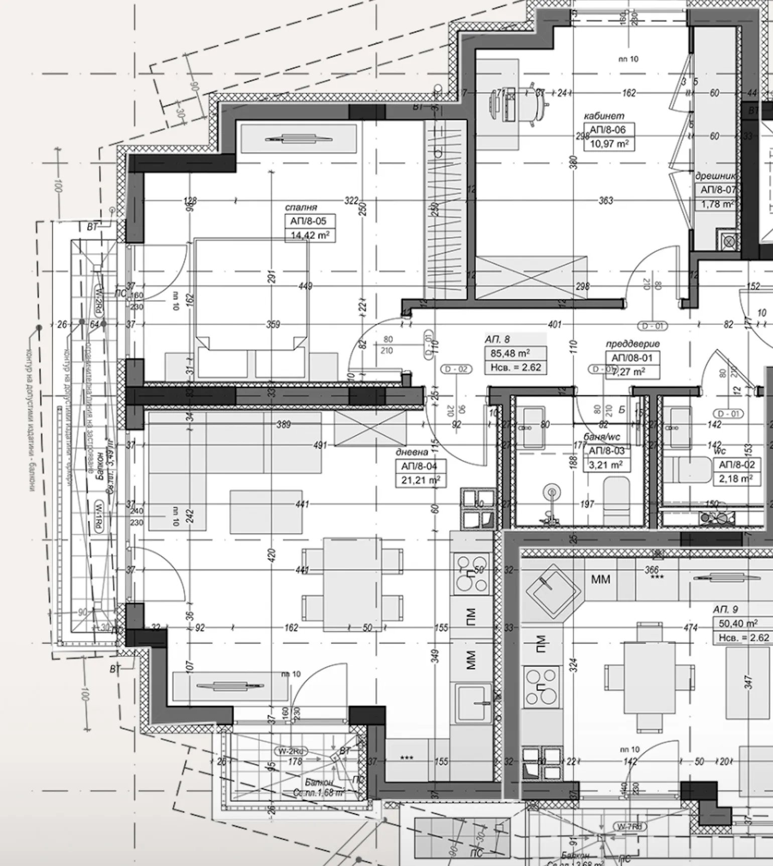 -Разпределение: антре, просторна дневна с кухненски бокс, две спалня, два санитарни възела и тераса.