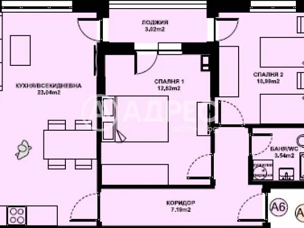 Предлаганият апартамент А6 на втори етаж с чиста площ от 71,05 кв.м / 76,083 кв.м с общи части / и има следното разположение: антре,дневна с кухненски бокс,две спални,баня с тоалетна и тераса.Към апартамента принадлежи и мазе с площ 7,25