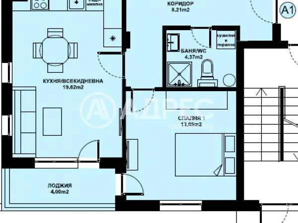 Предлаганият апартамент А1 на първи етаж с чиста площ от 58,03 кв.м / 62,75 кв.м с общи части / и има следното разположение: антре,дневна с кухненски бокс,спалня,баня с тоалетна и тераса. Към апартамента принадлежи и мазе с площ от 7,12 кв.м.