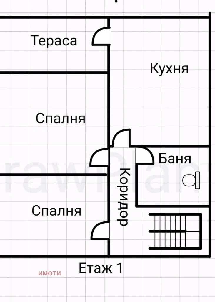 Етаж 1- кухня, две спални помещения,коридор, затворена тераса и баня с тоалетна.