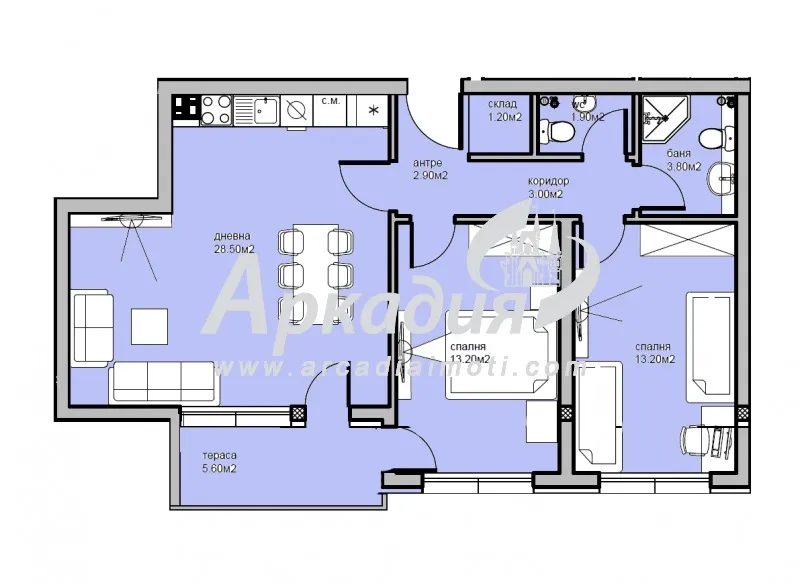 Разположението на стаите е следното - дневна с кухненски бокс, две спални,баня с тоалетна втора тоалетна,склад, входно антре,и една тераса. Жилището се предлага на шпакловка и замазка, входна блиндирана врата, ПВЦ-дограма от най-висок клас., монтирани ключове и контакти.