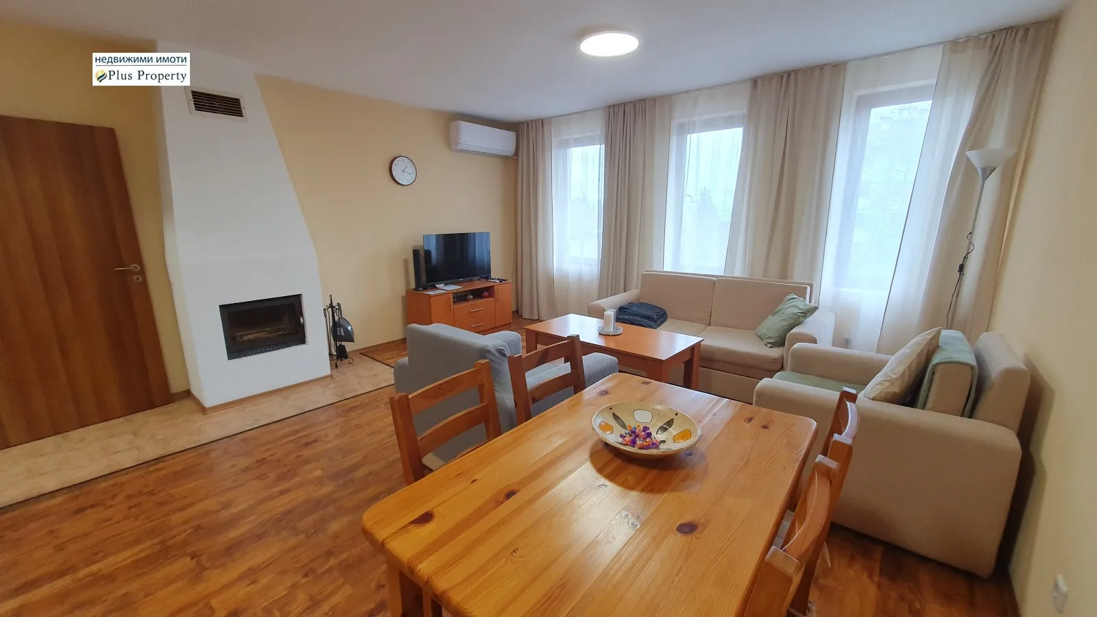 Предлагаме за продажба светъл и просторен тристаен апартамент с 2 бани в добре поддържан комплекс, разположен в местността Кошерината в Банско, на 15 минути пеша от ски лифта Гондола в Банско.Жилището е добре обзаведено и оборудвано, разположено на партерен етаж, с изложение юг/север, обща площ от 96 кв.м., от които застроената площ е 79,76 кв.м., а общите части са 16,24 кв.м.Апартаментът се състои от добре обзаведено входно антре, просторна всекидневна/трапезария с напълно оборудвана кухня с фурна, керамичен котлон, абсорбатор, хладилник и микровълнова печка, маса за хранене със столове, удобен разтегателен диван, два фотьойла, телевизор и камина на дърва. В коридора са монтирани пералня и сушилня. Главната спалня е обзаведена с двойно легло, нощни шкафчета и гардероб. От апартамента се открива красива гледка към вътрешния двор на комплекса. Втората спалня разполага с две единични легла, гардероб, нощни шкафчета и огледало. Банята е оборудвана с душ кабина, мивка, тоалетна, огледало и бойлер. В апартамента има малка отделна тоалетна.Отоплението е осигурено с климатик, електрически радиатори и камина на дърва.Имотът разполага с отделна партида за електричество.Този имот е отличен както за постоянно живеене, така и за отдаване под наем.Таксата за поддръжка е 9,6 евро на кв.м. годишно и включва асансьор, почистване и осветление на общите части, градинарство, СПА център през зимния сезон.Моля, обърнете внимание, че купувачът дължи комисионна в размер на 3% от договорената продажна цена. Виж всички обяви в plusproperty1.bazar.bg или тук