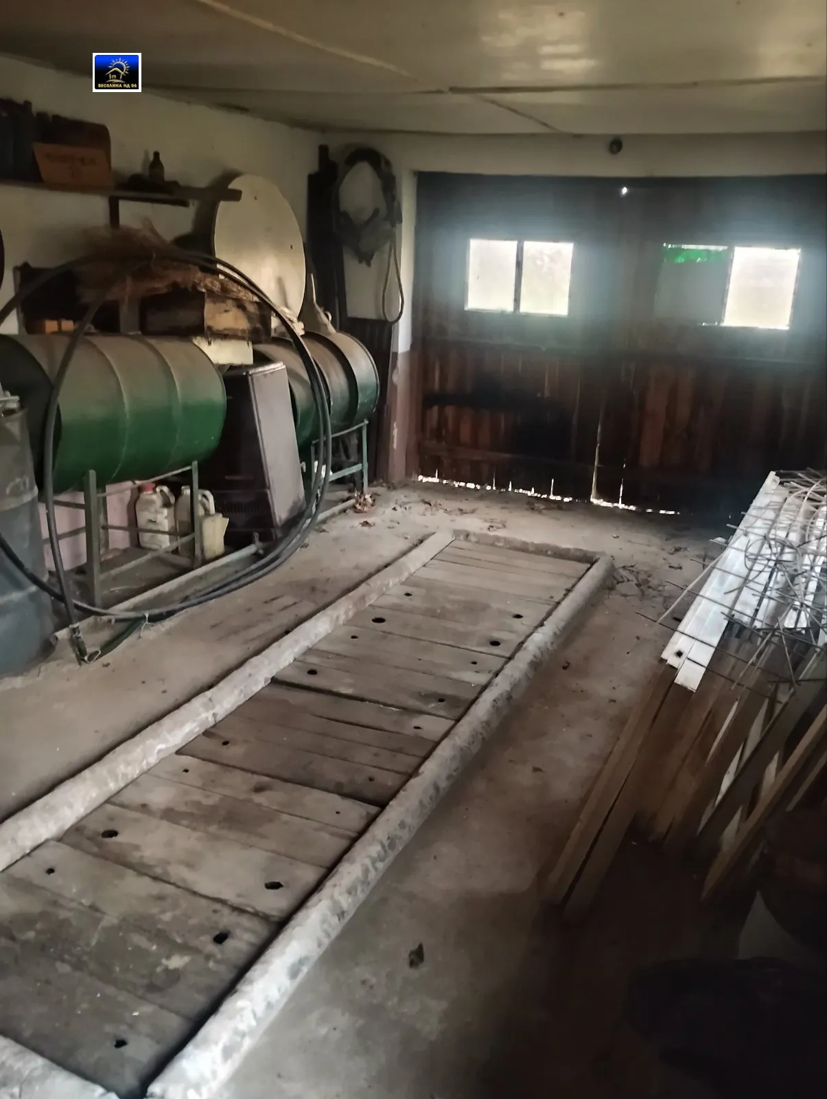 Четири стаи, салон, баня, изба, гараж, стопански постройки.