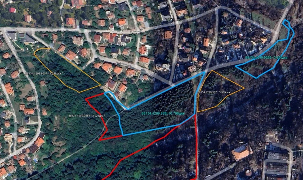 Поземлен имот, област София (столица),община Столична, гр. София, кв.Горна баня,район Овча купел. Имотът граничи с в.з.Горна баня и с улици-ул.Ехо и ул.Мечево усое, площ 10 798 кв.м (10,798 дка);територия Горска, НТП Друг вид дървопроизводителна гора,Брой върхове: 26 бр. На картата са отбелязани в син цвят двете актуални предложения в района./Обозначените в жълто и червено имоти са продадени/. Местоположение на ПИ: граничи със строителните граници на населеното място, в което се намира и граничи с пътната мрежа с трайна настилка. Трайно предназначение на територията: Горска; Начин на трайно ползване на ПИ: Друг вид дървопроизводителна гора; Категория на земята при неполивни условия:0. 'Бокар недвижими имоти', офис 'Неофит Рилски', тел.0887 09 70 73.