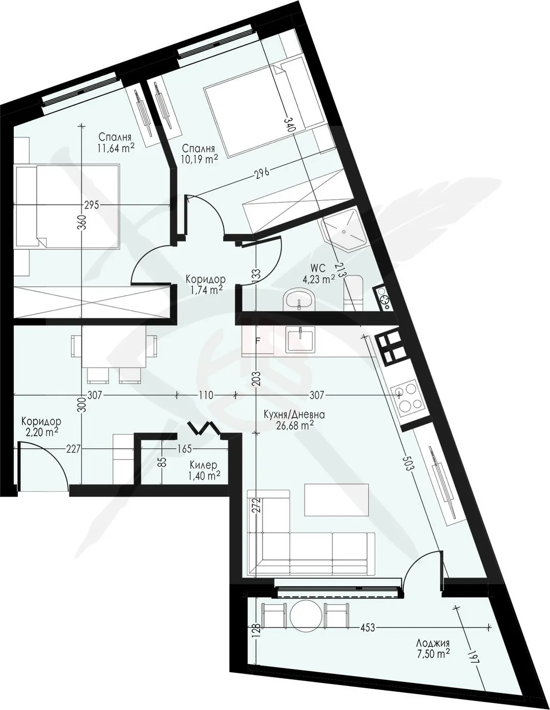 РАЗПРЕДЕЛЕНИЕ: Жилището разполага с площ от 96 кв.м., разпределена във входно антре, хол с кухненски бокс, две спални, баня с тоалетна, килер и тераса.