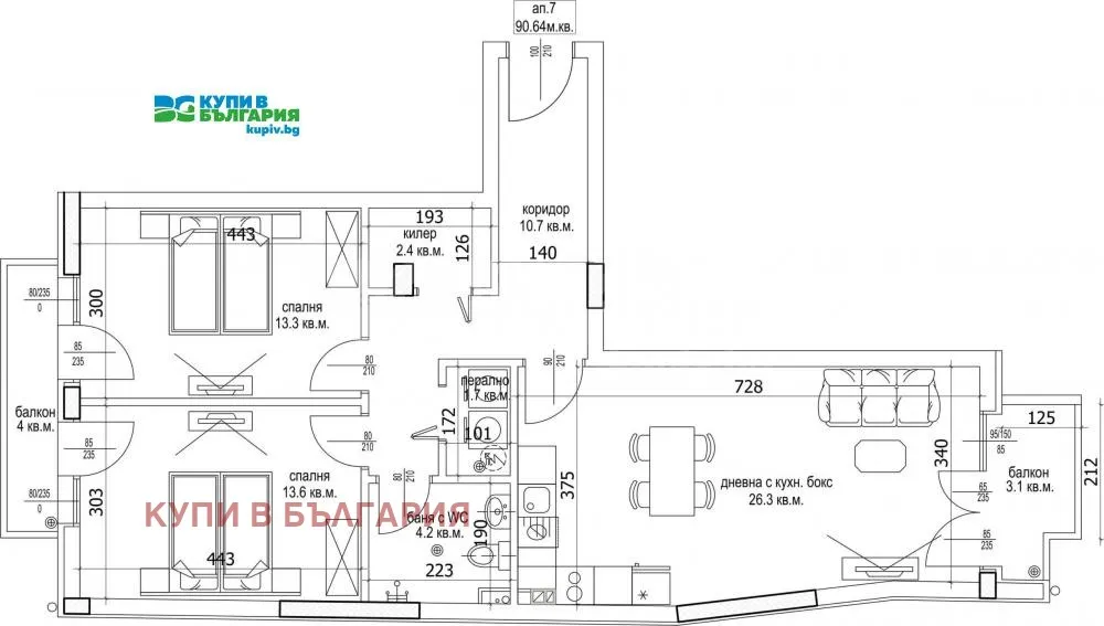 Тристаен апартамент дневна с кухненски бокс, 2 спални, баня с тоалетна, перално, килер, коридор и 2 балкона. ID 31557