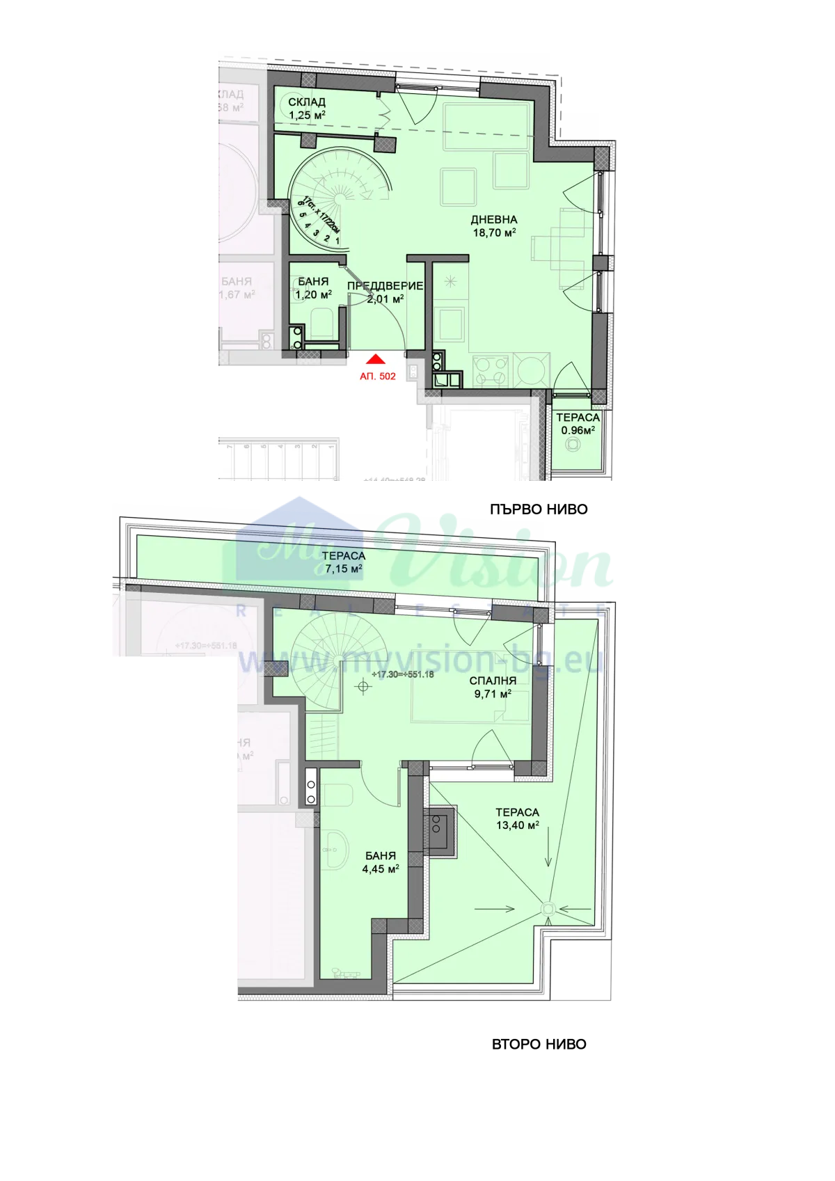 Ние от MyVision Real Estate Ви предлагамe мезонет състоящ се от: предверие, обширна и светла дневна с кухненски бокс, баня с тоалетна, склад и тераса. Това е първото ниво на мезонета. Второто ниво се състои от спалня, баня с тоалетна и две обширни тераси. Сградата е с високо качество на завършеност и дълготрайност на материалите. Фасадите са проектирани като 25см зидове от керамични тухли Wienerberger Porotherm, върху които е положен топлоизолационен слой EPS 10см. PVC дограма ALUPLAST Series 4000 (Германия), 5 камерен профил, с трислоен стъклопакет за най-висока енергийна ефективност, цвят на профила антрацит. Входни врати /апартаменти/ - SOLID, метална, цвят дъб, четириточково заключване. Настилки - подход сграда и паркинг – бетонови плочи Semmelrock (Германия); тераси и общи части - гранитогрес, като при терасите ще бъде мразоустойчив. На партерно ниво са разположени закрити паркоместа. Осигурено е и подземно ниво с паркоместа. Има възможност за закупуване на открито паркомясто ( 14,000) и закрито паркомясто ( 20 137).