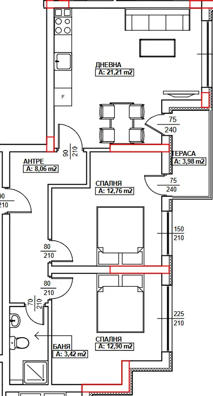 - дневна с трапезария с площ 21,21 кв.м.