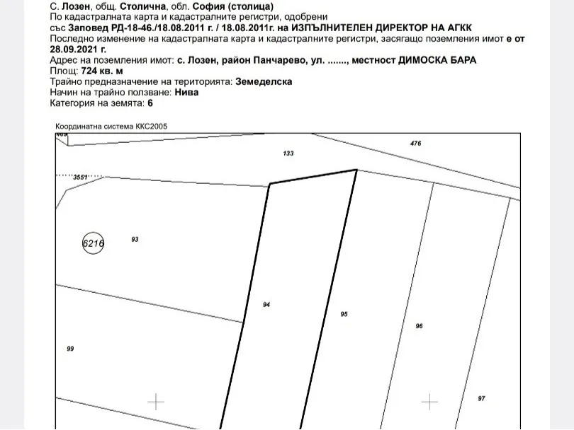 Агенция Имотен център предлага на Вашето внимание поземлен имот (земеделска нива с категория на земята 6) в района на с. Лозен, район Панчарево, местност Димовска бара. Площ 724 кв. м. За повече информация се обадете на посочения телефон.