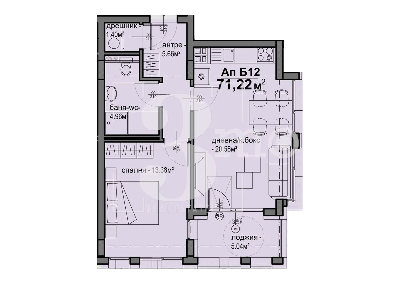 3mo Амалтея има удоволствието да ви предложи двустаен апартамент в нова модерна жилищна сграда с планирано разрешение за ползване в края на 2026-та година. Намира се в ж.к. Люлин 5 на комуникативно място. Предложеният имот е с обща площ от 71,22 кв.м. (застроена 63,35 кв.м.) и се състои от: входно антре (5,66 кв.м.), всекидневна с кухненски бокс и трапезария (20,58 кв.м.) с лоджия (5,04 кв.м.), спалня (13,38 кв.м.), дрешник/складово помещение (1,40 кв.м.), баня с тоалетна (4,96 кв.м.). Жилището е разположено на трети от общо девет етажа с изложение изток и север. Отоплението е чрез газ. Към имота може да се закупи паркомясто или гараж. Имотът е изключително подходящ за инвестиция. Инвеститорът е с богат опит, специализиран в изграждането на качествени жилищни сгради, като прилага най-новите технологии и иновации в строителството. В близост до имота са разположени множество търговски, хранителни и денонощни магазини и обекти. Също така детска градина, училище и удобен градски транспорт с бърз превоз до метростанции "Люлин", "Западен парк" и "Сливница". Връзката с централната и други части на столицата се осъществява посредством бул. "Петър Дертлиев", бул. "Добринова скала" и Околовръстен път.