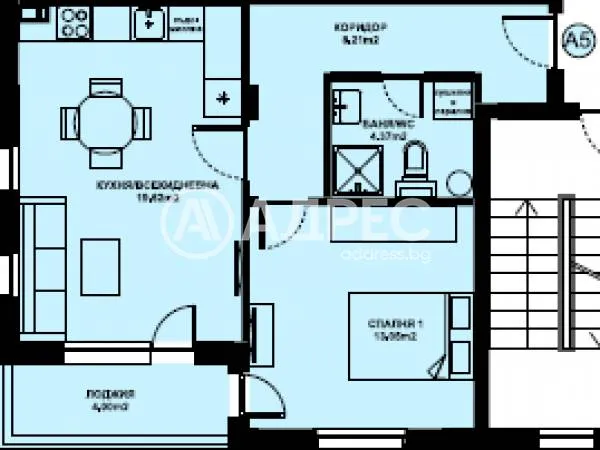 Предлаганият апартамент А5 на втори етаж с чиста площ от 58,03 кв.м / 62,75 кв.м с общи части / и има следното разположение: антре,дневна с кухненски бокс,спалня,баня с тоалетна и тераса.Към апартамента принадлежи и мазе с площ 8,04