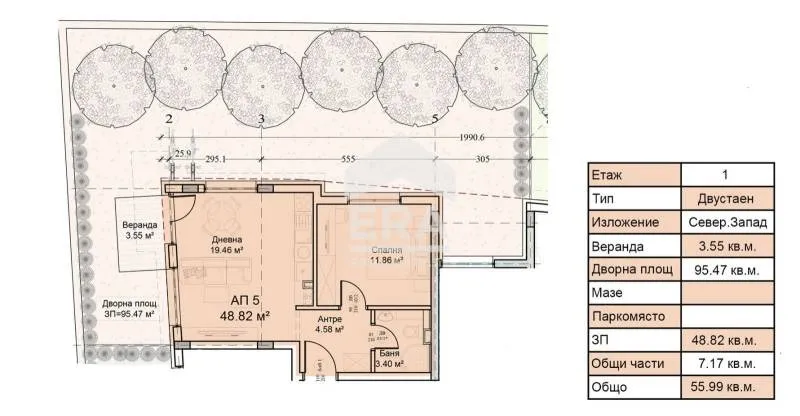 ЕРА Надежда продава един истински уютен и функционален двустаен апартамент в кв. Модерно предградие, разположен в нова сграда с вече издадено разрешение за строеж. Жилището е със застроена площ от 48,82 кв.м. и обща площ 55,99 кв.м., като към него принадлежи и прекрасно дворно пространство от 95,47 кв.м., което създава усещане за къща в града. Апартаментът е с изключително практично разпределение просторна дневна с кухненски бокс от 19,46 кв.м., уютна спалня с площ 11,86 кв.м., баня с тоалетна, антре и веранда от 3,55 кв.м., която плавно свързва вътрешното и външното пространство. Изложението е север-запад, което осигурява естествена светлина през целия ден и комфортна температура през летните месеци. Сградата ще бъде с модерна архитектура и висококачествено изпълнение, а районът предлага отлична инфраструктура и бърз достъп до центъра на София, както и близост до магазини, училища и градски транспорт. Това е идеален избор както за собствен дом, така и за инвестиция с висока възвращаемост, благодарение на комбинацията от практична квадратура, самостоятелно дворно място и отлична локация. Не пропускайте възможността да осигурите бъдещия си дом в една от най-бързоразвиващите се зони на столицата.
