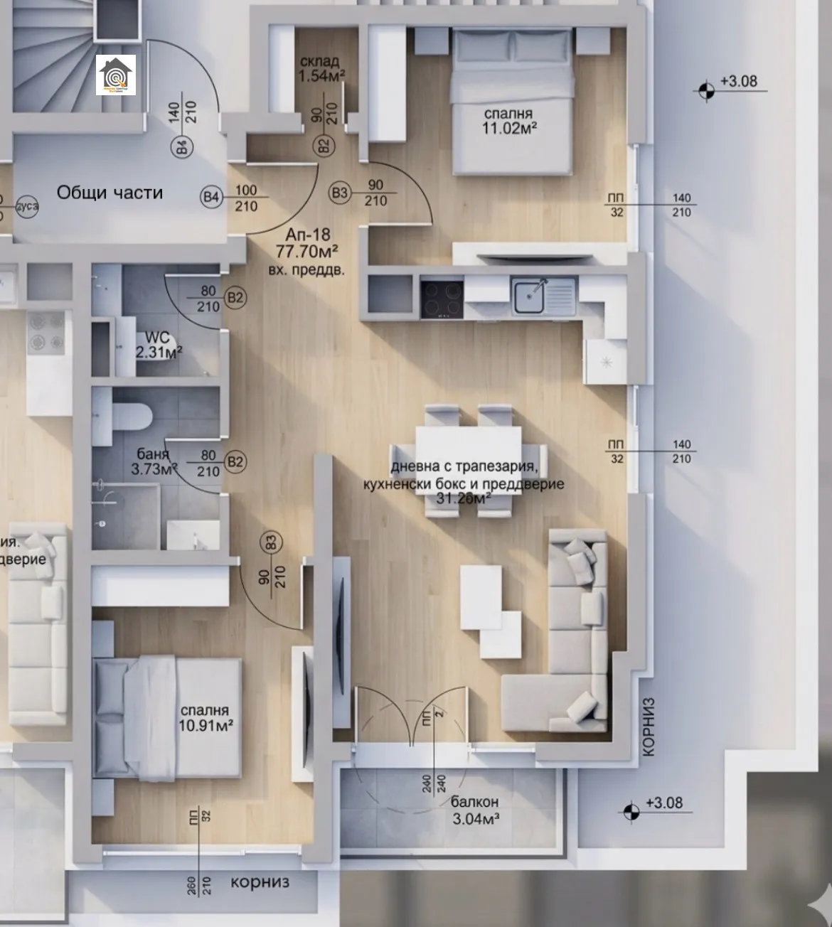 Описания апартамент е разположен на 4ти от 6ти етаж , с чиста квадратура 78кв.м.