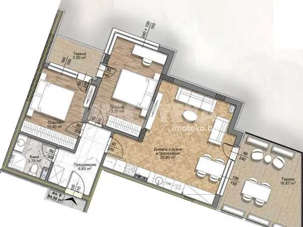 Тристаен апартамент със североизточно изложение и с чиста площ 94,50 кв.м. Състои се от дневна с кухня и трапезария- 26,60 кв.м., две спални съответно по 13,20 кв.м. и 10,60 кв.м., един санитерен възел и две тераси - северна 3,5 кв.м и североизточна - 16,67 кв.м.