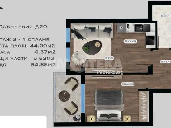 Жилищната площ е 48.37 кв.м, а общите части са едва 5.63 кв.м.