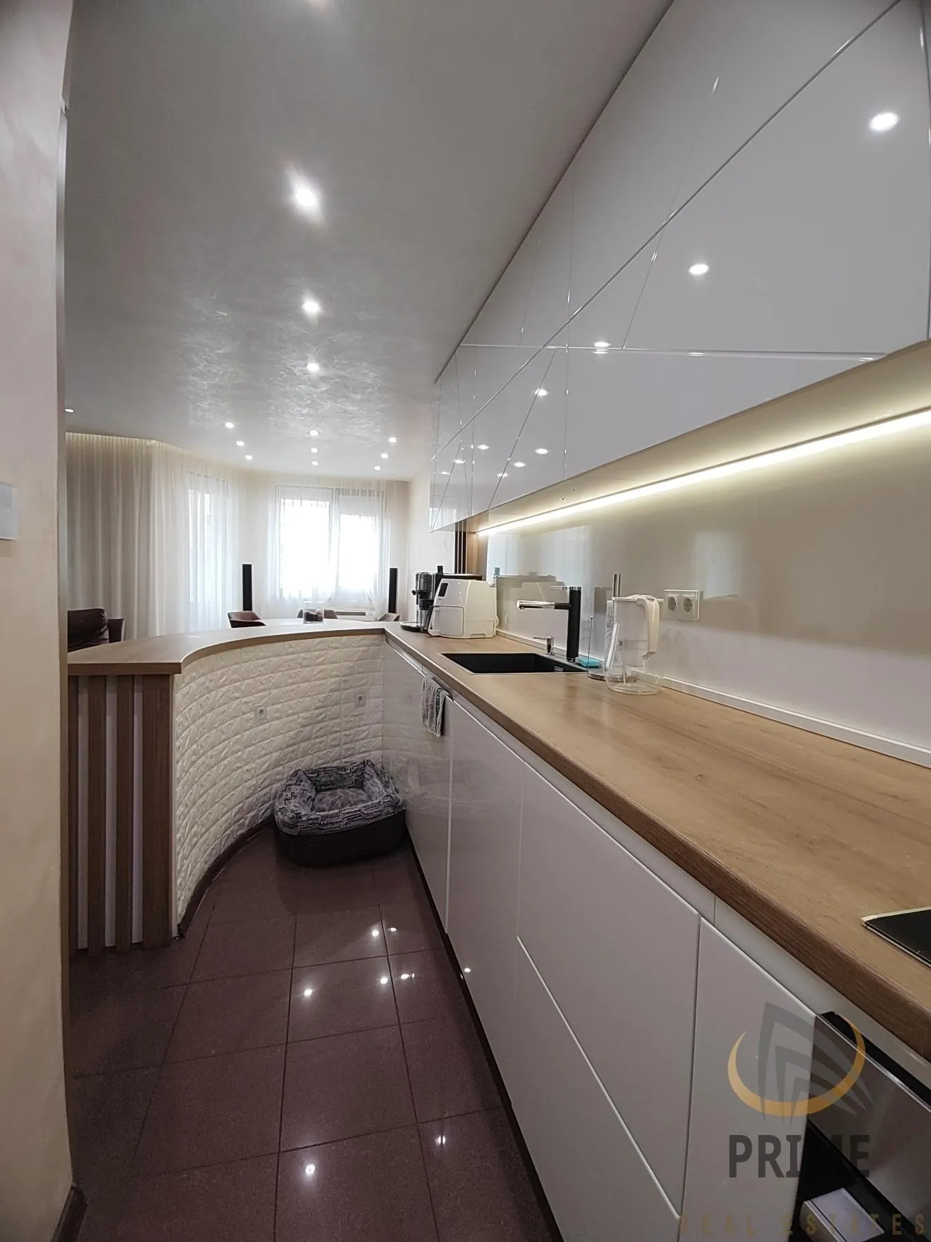 Апартамента е луксозно обзаведен и завършен до последния детайл с висококачествени материали и мебели от масивно дърво, мека мебел от естествена кожа. Кухнята е изцяло оборудвана с всички нужни уреди за едно домакинство, изградена от MDF вътрешно и външно с плавно затварящи се механизми марка 'Bloom'. Апартамента се отоплява и охлажда с климатици. Банята и тоалетната са отделни, със санитария 'Grohe' и 'Roca'. Втората спалня е не обновена, но също е в много добро състояние с естествен паркет и мебели от масивно дърво. Самостоятелен гараж (30 кв.м) с Ролетна щора и механизъм Hormann, който е с вътрешен кухенски бокс и баня с тоалетна.
