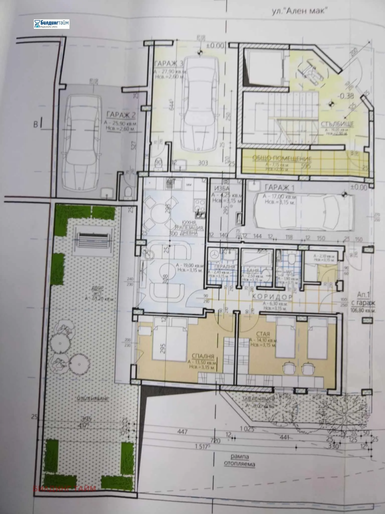 Апартамент / етаж от КООПЕРАЦИЯ /, в малка , триетажна ,бутикова сграда ново строителство - между Арена / Ритейл парк и Лидъл-пазара. Апартаментът е 123 кв.м. с гараж 17 кв.м. и двор 62 кв.м. Апартаментът е със самостоятелен от жилищната кооперация вход. Разполага с гараж с подход непосредствено до входа на жилището и изба 5 кв.м. в която се влиза от гаража. От гаража се влиза в малък двор, който е пред входа на апартамента и е с ограда към улицата. Така жилището е обособено като самостоятелна , едноетажна къща с двор . Като малък двор има пред входа на жилището и 62 кв.м. озеленен двор има пред дневната и едната спалня.