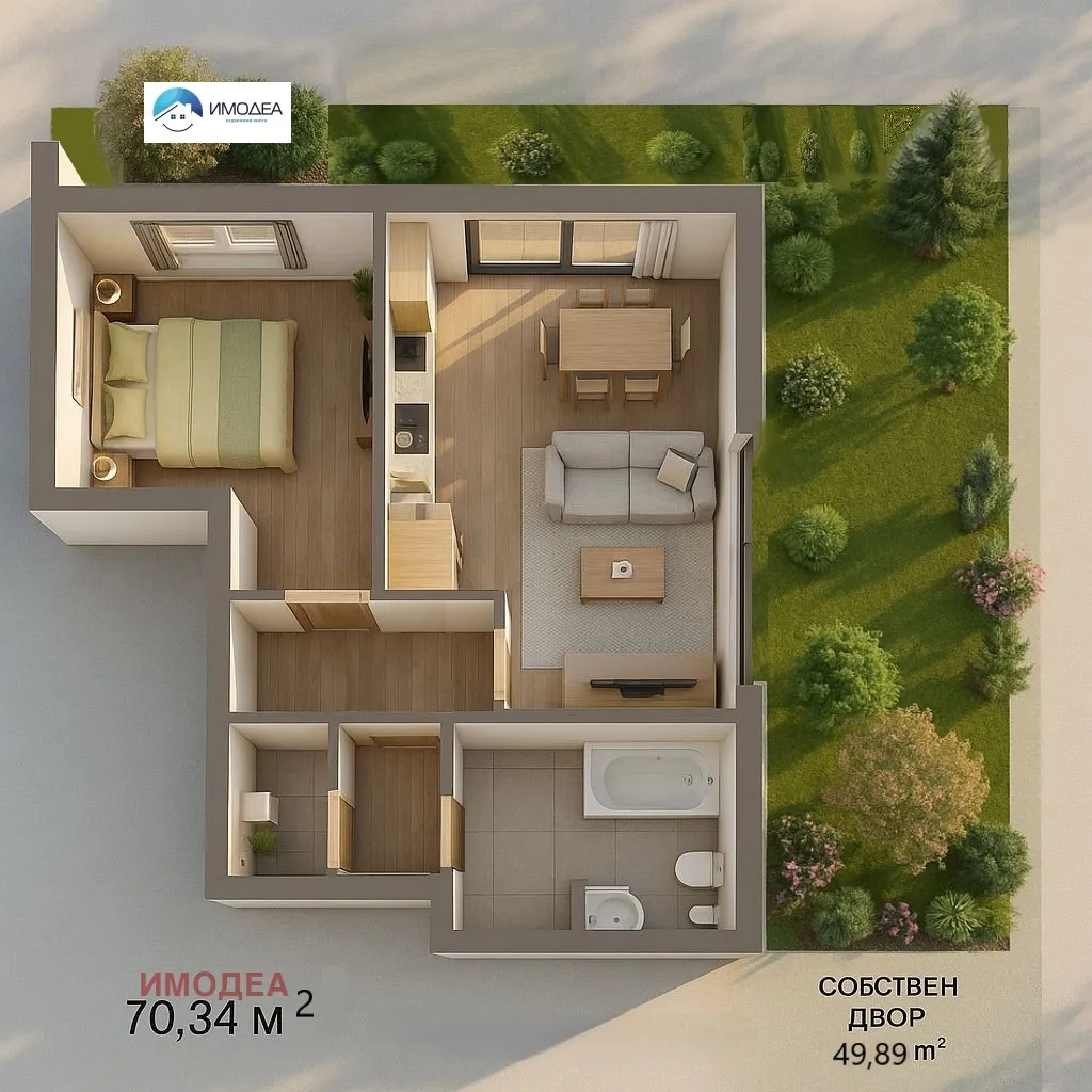 Предлагаме за продажба двустаен апартамент със собствено дворно място, разположен на партерен етаж в сграда Форест Гардън в кв. Зона Б, гр. Велико Търново.