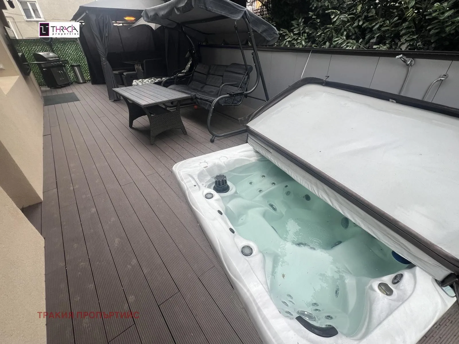 'Thracia Properties' представя луксозно завършен и обзаведен етаж от къща, представляващ четиристаен апартамент с 287 кв.м.от двора,1 надземно паркомясто и гараж. Намира се на тихо и спокойно място, но същевременно много комуникативна локация!В близост до спирки на градски транспорт, училище, детска градина, магазини, паркова среда. Апартамента е изцяло оптимизиран със СМАРТ УПРАВЛЕНИЕ.АПАРТАМЕНТ: Просторен, много светъл С ИЗТОЧНО/ЮЖНО ИЗЛОЖЕНИЕ със застроена площ 120 кв.м., разположен на целия първи етаж на сградата и с разпределение: - просторен хол с трапезария и кухня - тип open space - две самостоятелни спални - Тераса - Баня с тоалетна - Коридор - Мокро помещение- Джакузи в двора с вграден хладилникЗАВЪРШВАНЕ: Луксозно завършване с поръчкова кухня, Окабеляване; Видеонаблюдение, СОТ; Smart осветление. ОБЗАВЕЖДАНЕ: Кухня - двойна готварска печка, керамични котлони, хладилник с фризер и диспенсър, съдомиялна машина;Хол и трапезария - холона гарнитура, холна маса, телевизор, трапезна маса за 6 човека;Родителска спалня - спалня, гардероб, скрин с тоалетка, телевизор; Втора спалня - спалня, гардероб; Мокро помещение - пералня; Коридор - шкаф за обувки; ПОДОВИ НАСТИЛКИ: Ламиниран паркет в спалните, хола, кухнята и коридора; Гранитогрес в санитарните помещения; Тераса: луксозно завършена с декинг иджакузи. ОТОПЛЕНИЕ: Ток - Smart конвекторни радиатори, Топла вода - бойлер; PVC дограма в целия апартамент; ПРЕДИМСТВА: Чисто нов, с ново оборудване и обзавеждане, готов за нанасяне. За повече информацияи огледи тел:Красимира Уилямс - 0884 556 480: ИванаМогилкова - 0882 782 667; Биляна Борисова - 0876 922 769