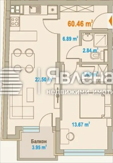 До основни пътни артерии, градски транспорт и две метростанции! На пешеходно разстояние от центъра на столицата. Предлагаме за продажба изключително стилен и функционален двустаен апартамент (ап. 8) в модерна и елегантна жилищна сграда, от висок клас, разположена на ключова и комуникативна локация в широк център на София. Сградата впечатлява с елегантна архитектура, изчистени линии и висококачествени материали. В строеж на ранен етап. С най-иновативни материали, вкючително тухли Wienerberger и висок клас PVC. Гарантирана отлична енергоефективност на сградата, посредством най-висок клас дограми, фасадни облицовки и топлоизолации от водещи производители, осигурява ниски сметки на отопление и електривеството. Сградата се отличава със стилна и съвременна визия, като хармонизира с градската среда. Външното LED осветление подчертава формите и създава усещане за престиж и сигурност. Общите части са луксозно изпълнени, входът е представителен, а околността – тиха и добре поддържана. Намира се в близост до търговски вериги, училища, детски градини, здравни заведения, ресторанти и кафенета, магазини, супермаркети и мол София. Параметри на апартамента: Обща (чиста) площ: 60.46 m². С общи части: 83.54m². Етаж: 4ти в модерна многоетажна сграда от 14 етажа. Крайна цена: 198 800 евро. Цената включва ДДС. Изложение: на запад, с отлично естествено осветление през целия ден. Балкон: 3.95 m² – идеален за сутрешно кафе или малка градина с растения. Разпределение: Просторна дневна с кухненски бокс – 22.50 m². Отворено пространство, подходящо за кът за почивка, трапезария и модерна кухня. Големите прозорци осигуряват светлина и усещане за простор. Спалня – 13.67 m² Комфортна и добре пропорционирана стая, подходяща за голямо легло и гардероб. Антре – 6.89 m². С възможност за вградени шкафове и удобно съхранение. Баня – 2.84 m². Компактна и функционална, с възможност за поставяне на душ кабина. Склад/ниша – 1.69 m². Идеално място за пералня, сушилня или допълнително съхранение. Предимства на имота: Нова и висококачествена сграда. Модерен дизайн и първокласни материали. Светъл и функционален апартамент с оптимално разпределение. Топ локация, подходяща както за живеене, така и за инвестиция. Предлагат се и довършителни работи за привеждане на имота до ключ, с доплащане. Възможно е и покупката на паркомясто (30 000-35 000 евро) или гараж (45 000 евро). За оглед и повече информация, свържете се с Надежда Цолова.(http://www.yavlena.com/165035) ID:Z-165035