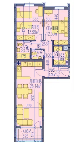 дневна с трапезария, 2 спални, баня и wc, wc, дрешник, терасa