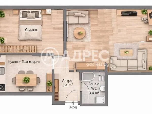 Обзаведен двустаен апартамент, състоящ се от вестибюл с дневна, спалня, самостоятелна кухня и баня с тоалетна.
